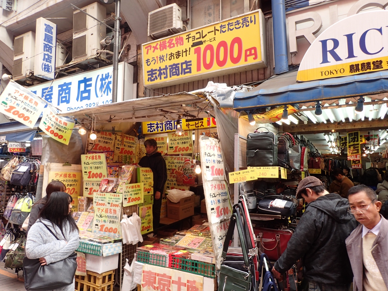 アメ横は上野駅から御徒町駅迄の間の山手線沿いにあります。以前は問屋街でしたが、現在は料理屋等も多くあり、一般客や外国人等いつも多くのお客で賑わっています。特に最近は外国人が多く、スーツケースを引きずりながら、買い物を楽しむ外国人も多いです。