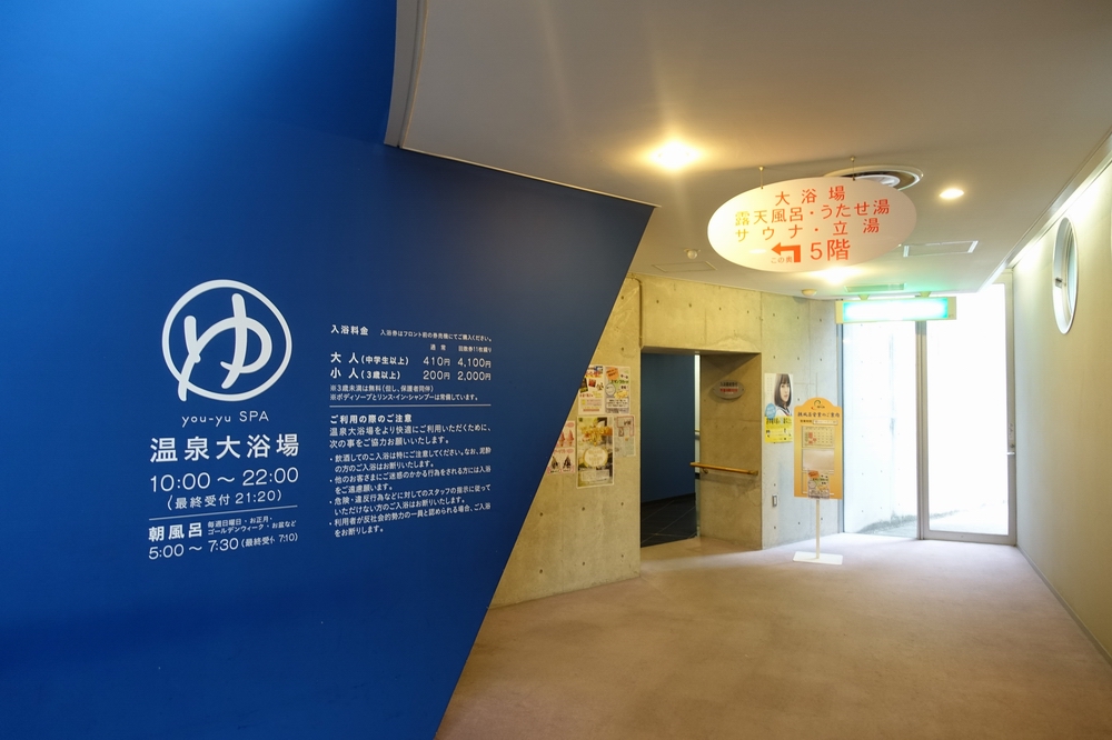 日帰り専門の温泉施設なので宿泊しなくても玉造のお湯に入ることができます。自分は宿泊しましたが、インパクトのある外観が気になったので行ってみることにしました。入浴料金が大人410円とお手軽で嬉しいです。1階が売店になっていて島根のお土産や野菜等を販売。温泉は5階にあるので売店を通り抜けた先のエレベーターで上がって移動します。