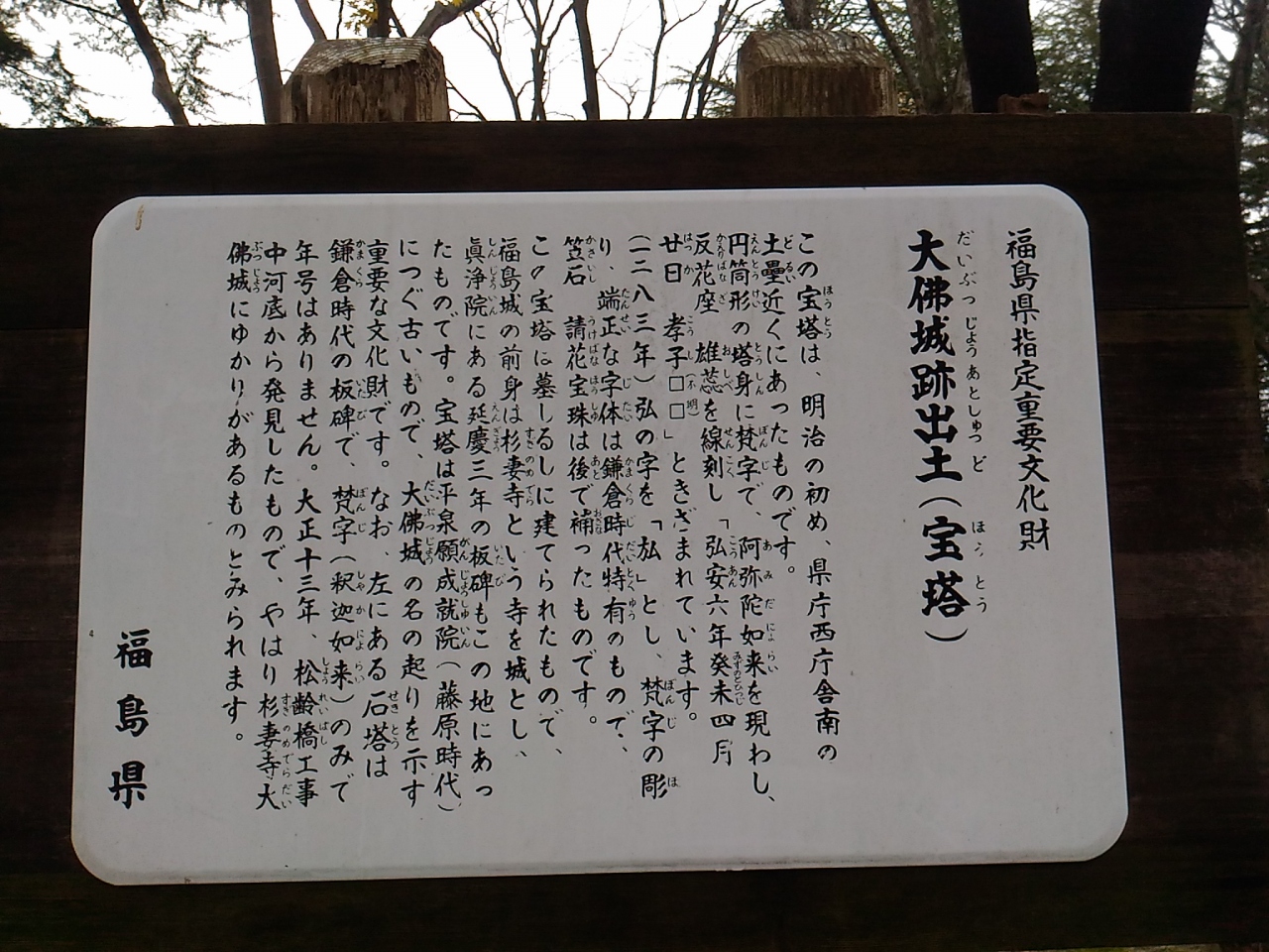 JR福島駅の東口から徒歩20分、紅葉山公園内に大仏城趾の説明板がたっています。この場所はもともと福島城の二の丸に当たる場所のようです。周辺には県庁を中心に彼方此方に福島城後の史跡もあるので散策してみてはいかがでしょうか、是非。