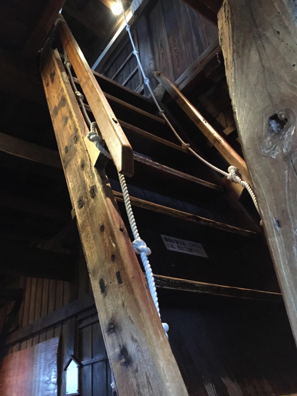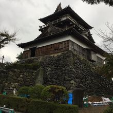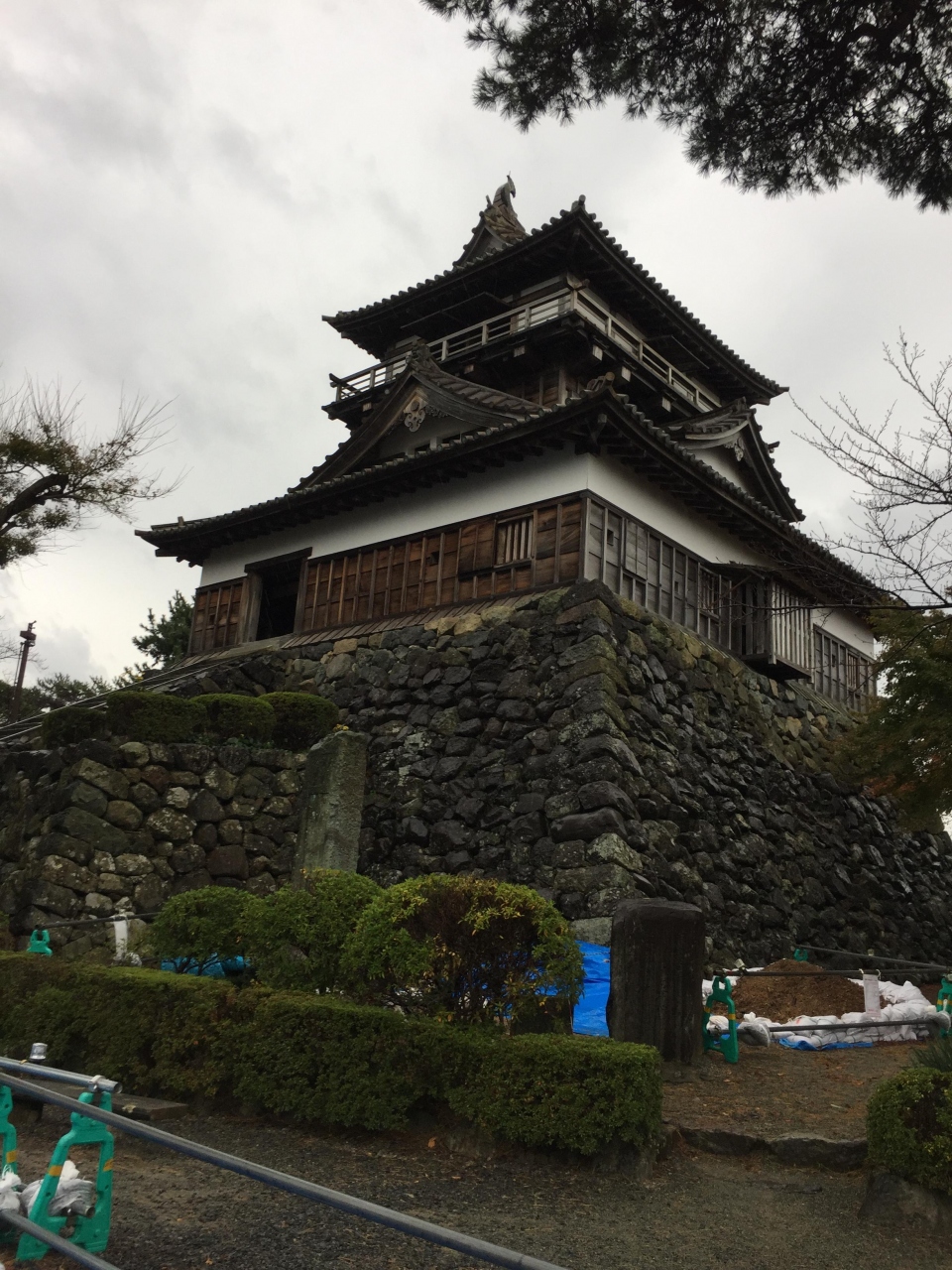 屋根は二重で三階建ての天守。二階と三階が同じ面積で狭い。階段は50度で、現存城の醍醐味を味わえます。
