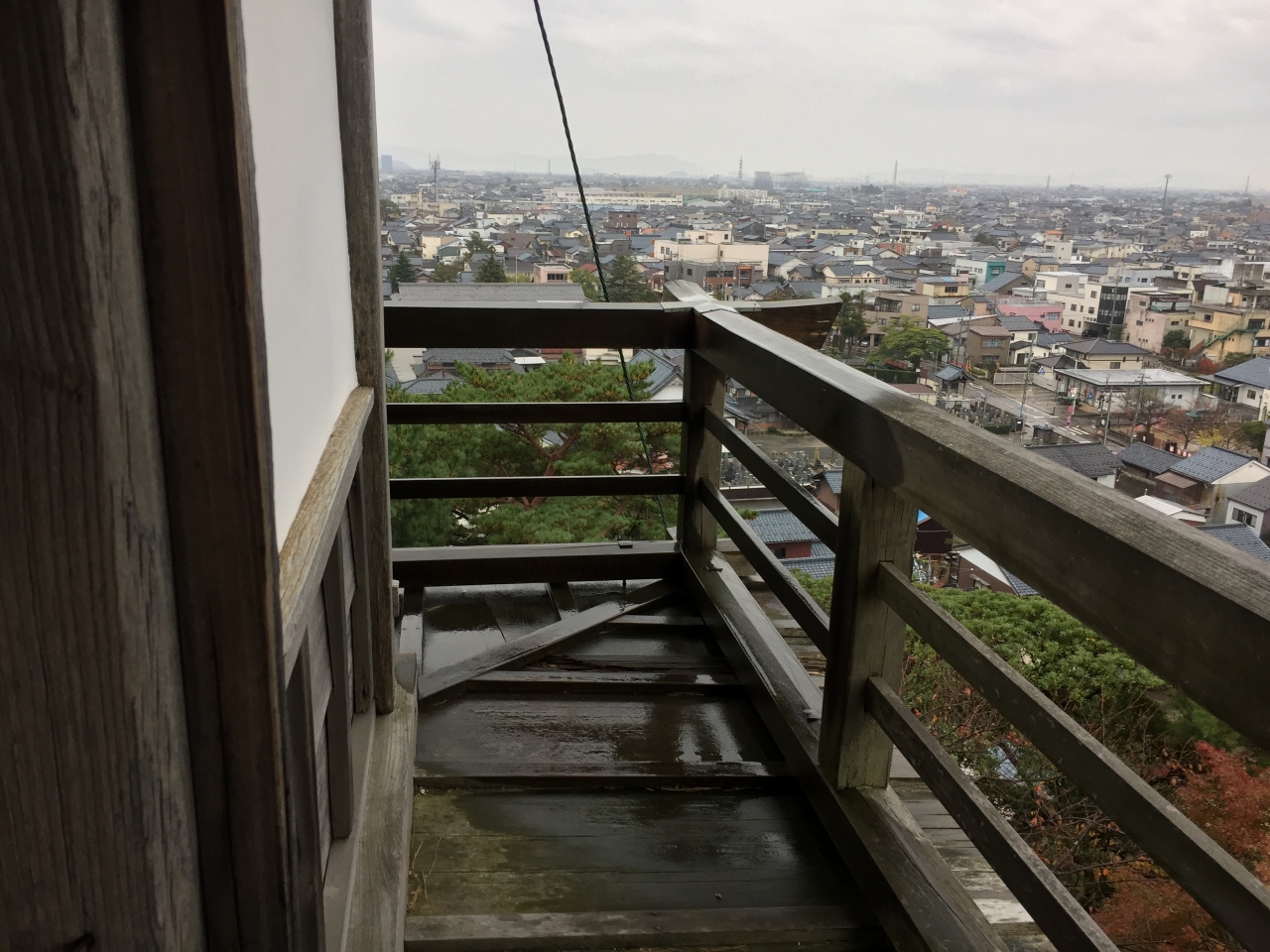 丸岡城は1576年築城で現存城では最古。外観は上層望楼を形成して通し柱なし。一層は二階、三階を支える支台をなし
