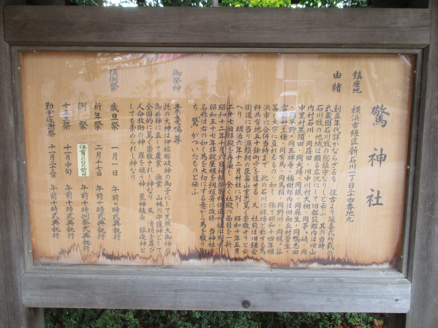 東急田園都市線あずみ野駅から新石川方面に進み歩いて10分ぐらいで驚神社に着きます。驚神社の創建は奈良時代に造られたとの伝承がある歴史ある神社で、名前由来は昔この辺りは牧場があり名馬が育った場所から「馬を敬う」の二字を合成して「驚」となったそうです。鳥居から本殿までの参道は長く境内も広く歴史、由緒ある神社を感じられ見ごたえあります。現在は七五三詣で参拝者が急増してるそうですのでお立ち寄りをお奨めします。