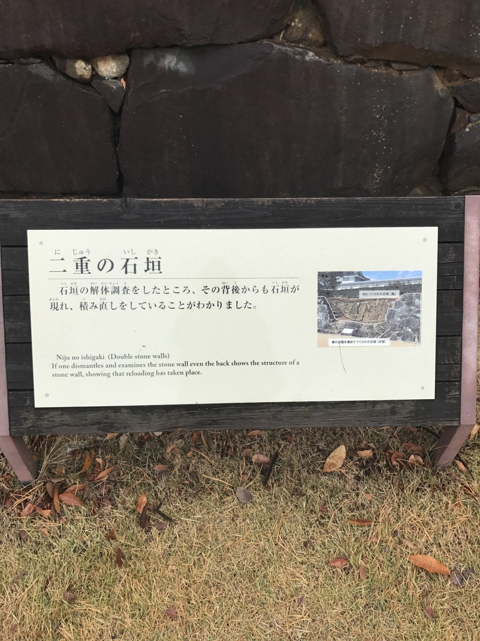 歴史公園ないにある甲府城の二重の石垣は、最近の発掘調査により、積み上げ方法はもとの石垣の上に一石ずつのづら積みで自然石をそのまま積み上げる方法ですが、もともとあった当時の石垣に新たな石垣を積んでいることがわかったそうです。