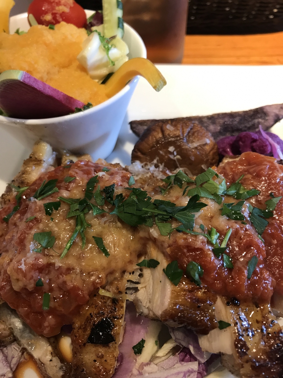 甲府夢路地にある山梨レストランのメリメロです。カウンターとテーブル席が数席の小さな店舗ですが、結構人気のお店で混んでました。ランチメニューに若鶏グリルにサラダとスープにフォカッチャとドリンクにデザートがついて1800円です。
