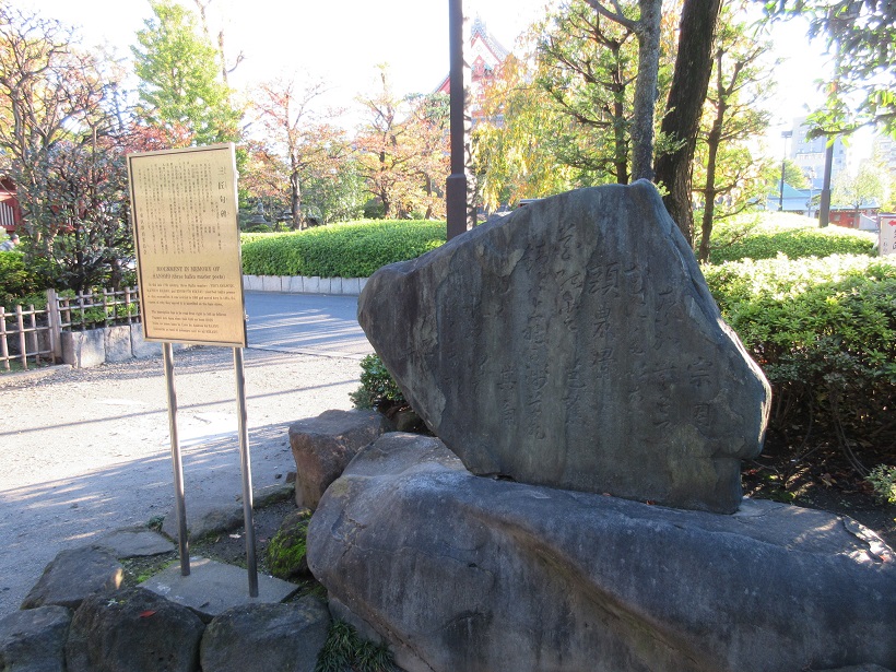 浅草寺の本堂から西に向かい、「奥山おまいりまち」に抜ける手前、数多くの石碑の集まる一角がありました。その中で見つけた碑がこちら三匠句碑です。三匠とは江戸時代を代表する西山宗因・松尾芭蕉・榎本其角のことを指すそうで、それぞれの句が一句ずつ、併せて三句刻まれているので、このように呼ばれています。寡聞にして松尾芭蕉以外の俳人は知らなかったのですが、機会があれば他の二名についても色々調べてみたいと思いました。