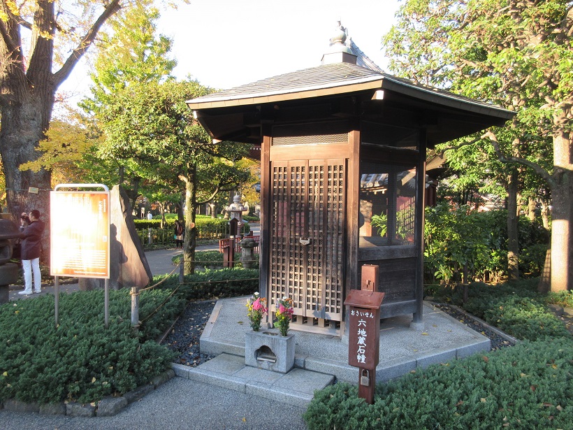 浅草寺本堂から西に進み、影向堂の近くに六地蔵石灯籠がありました。六地蔵石灯籠は作平安時代から鎌倉時代あたりに作られた石灯籠とのことで、木のお堂に守られる形で保管されていました。金網越しで見るしかないので見えにくかったですね。見学しやすい他の方法を考えてほしいと思いました。