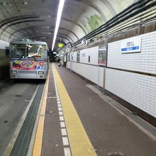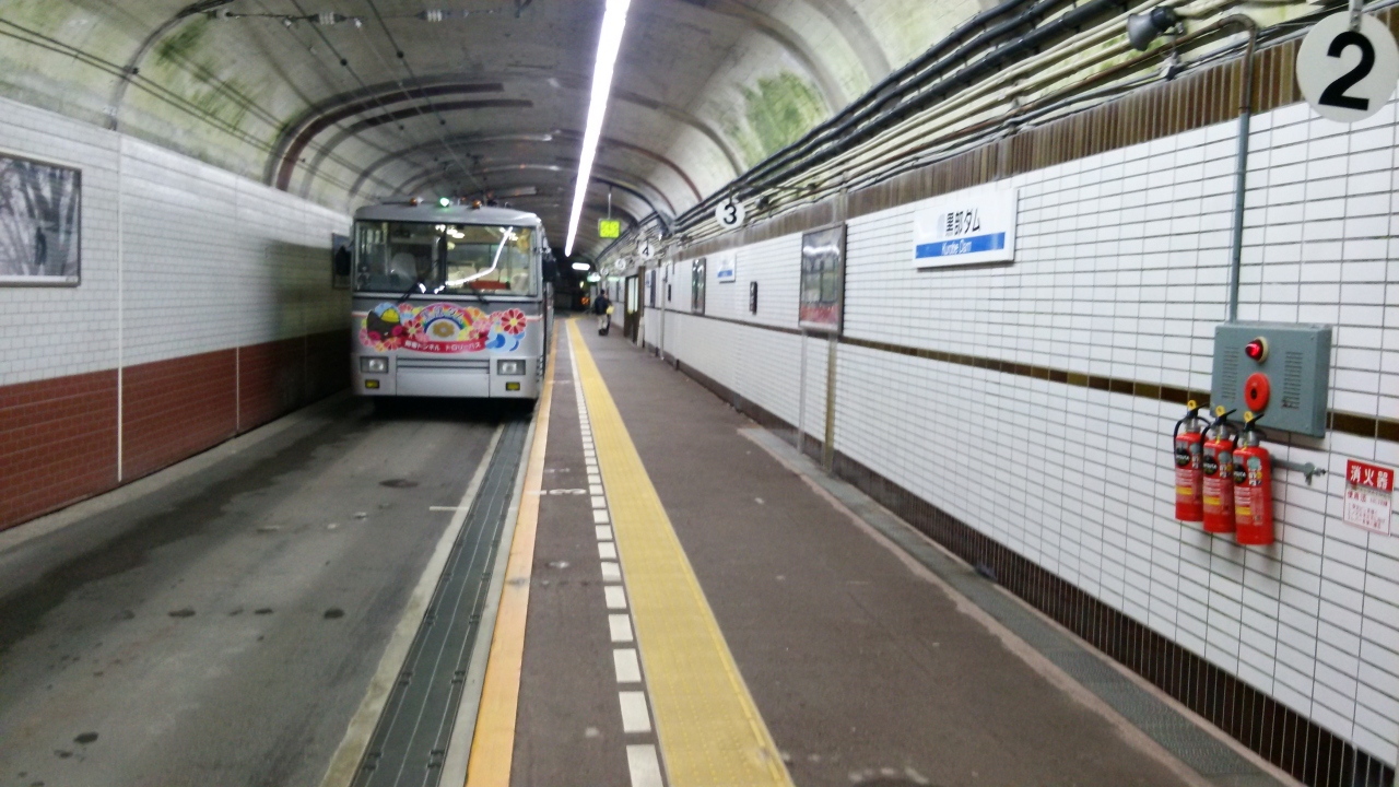 ほぼトンネルの中なので車窓は良くありませんが、トンネル内には掘削時に苦労した「破砕帯」を示す青いランプや、黄色のランプの県境の標識、トンネル貫通時の貫通場所などが表示されています。対向バスとすれ違う際には少々運転停車します。もちろんドアは開きません。
