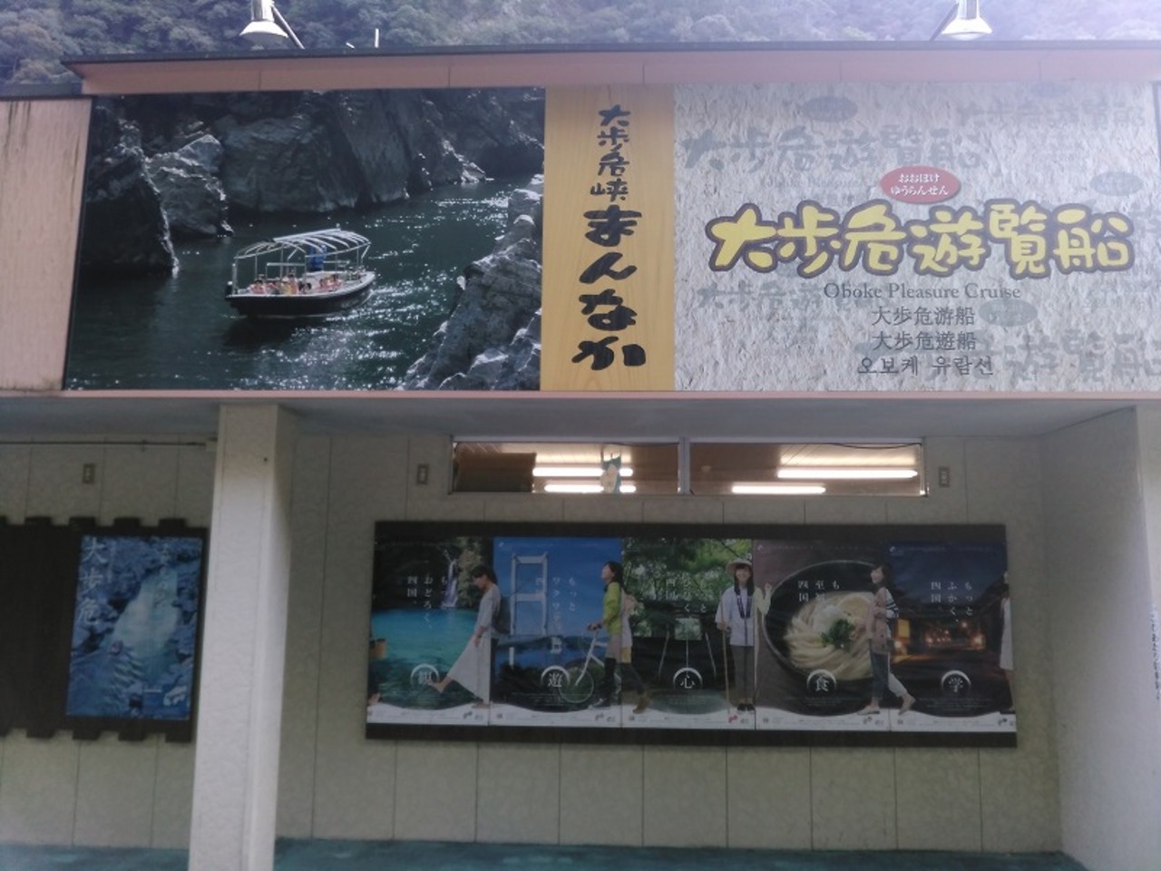 大歩危を船の上から見渡せる遊覧船乗場には、お土産屋とレストランが併設されています。お土産屋はクレジットカードが使えます。レストランは祖谷そばが400円で食べられる他、ひとつ目丼やひだるラーメン等妖怪シリーズのメニューもあります。