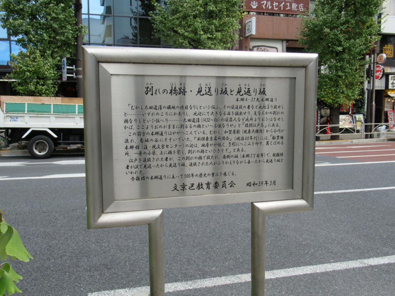 文京区の本郷三丁目交差点から本郷通りの左 (西) 側歩道を赤門方向 (北側) に5,60m行った右手 (車道側) に、「別れの橋跡・見送り坂と見返り坂」の説明板が立ててあります。