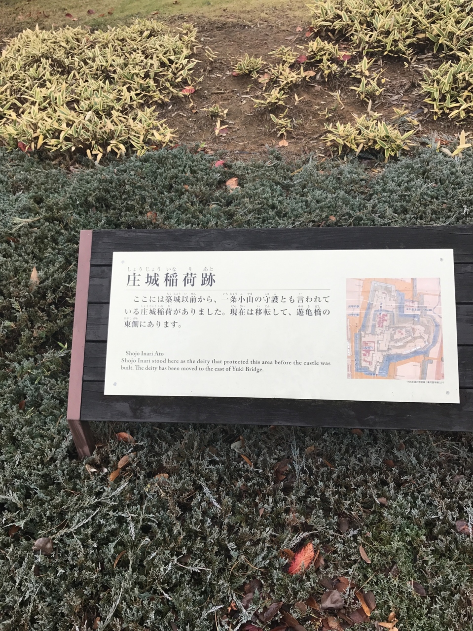 山梨は甲府城にある、城城稲荷あとであり今は鶴丸公園として一般開放している場所であります。ここには築城以前より、一条小山の守護とも言われている庄城稲荷がありました。現在では、場所を移していて遊亀橋の東側にあります。