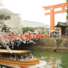 鳥居の前に岡崎疎水があり桜と大鳥居、船のアングルがお勧めです。
