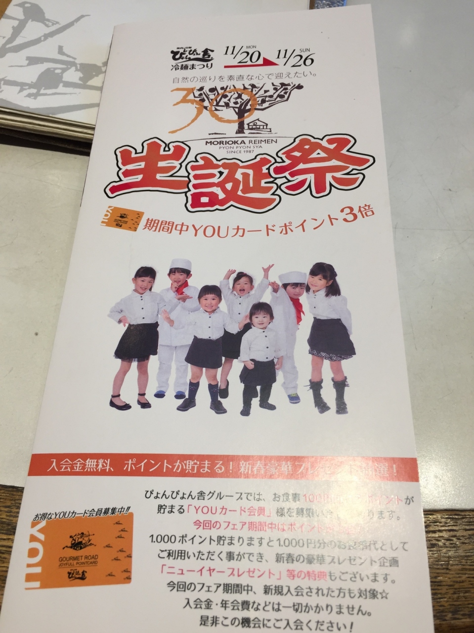 11月20から26日まで冷麺祭りが行われています。冷麺など麺類が500円、ビールや焼肉もお祭り価格で提供されていますが、焼肉は満足度低いです。美味しくはありません。ホルモンならまだいいかも。早々に食べて切り上げました。