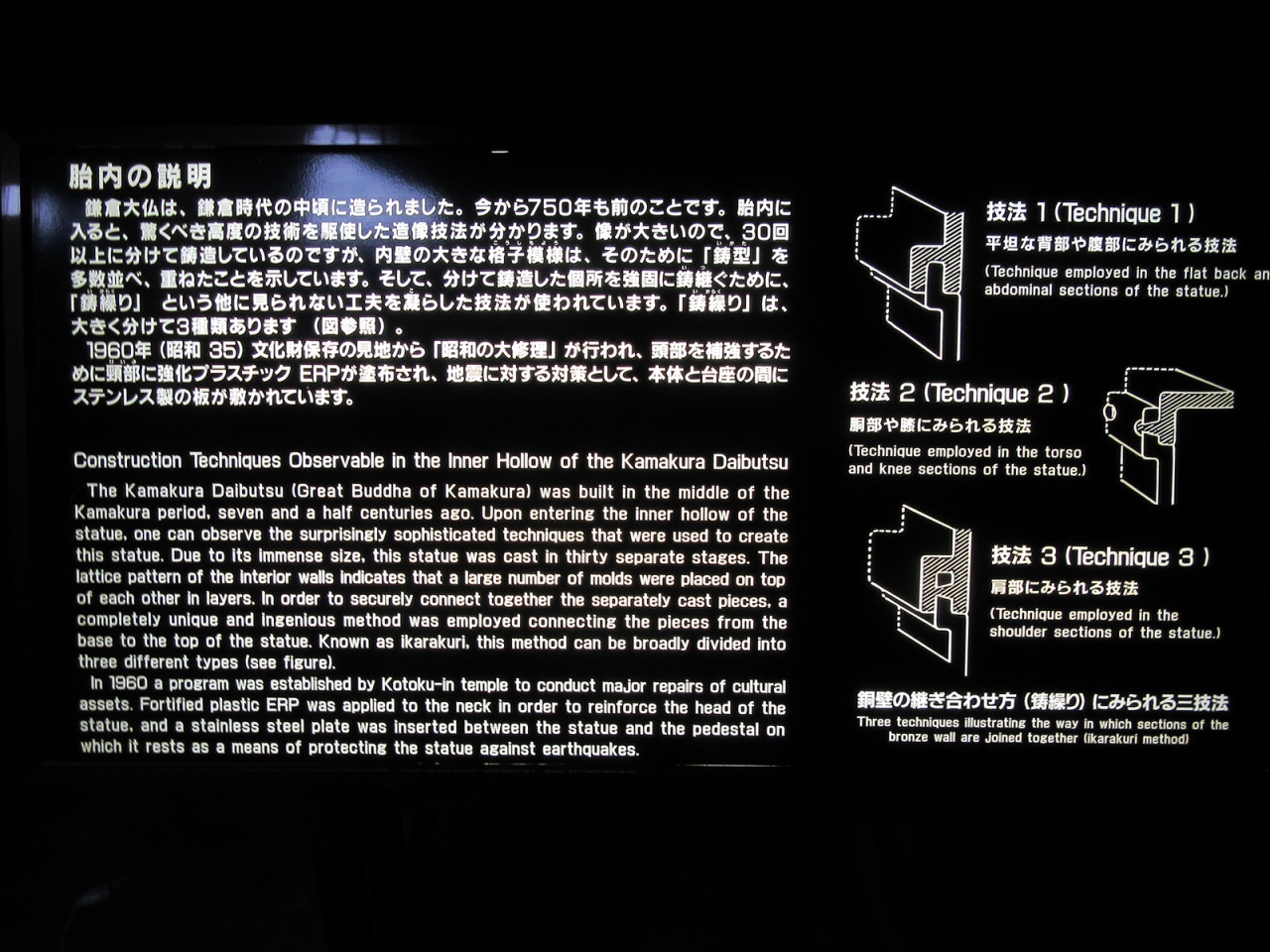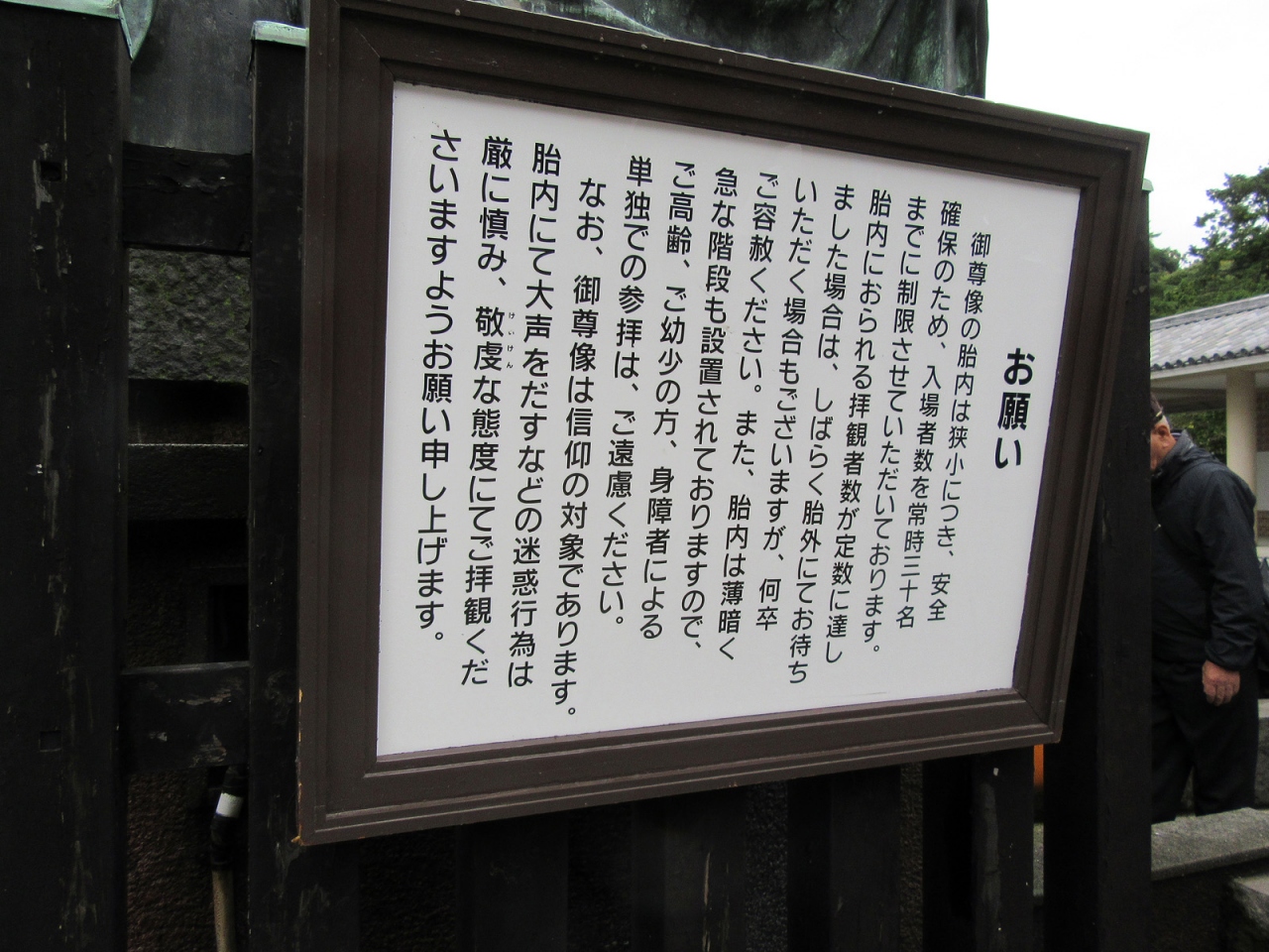 国宝を見られる機会でさえ、さほど多いとは思えないのに、こちら鎌倉の大仏様は、その胎内にまで参拝することができる、まことに有り難いことです。さらに750年以上前の匠の技を目の当たりにもできることも、本当に貴重な経験です。胎内拝観は別途20円必要です。また体内の階段は暗くて狭いので、お年を召した方などはお気をつけ下さいね。