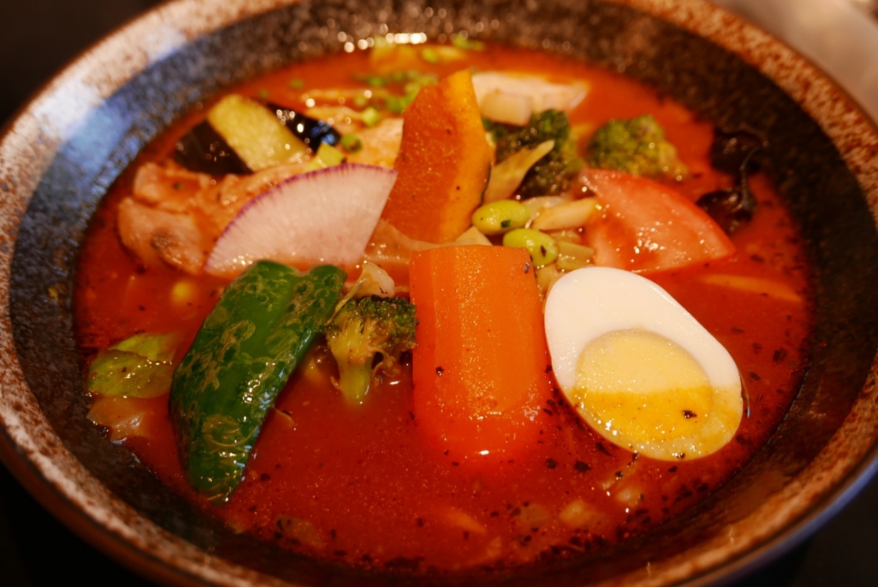 札幌市の北区にあるカレー店です。お店の裏側に駐車場もあります。店内は広くて大人数でも大丈夫です。メニューはスープカレーがメインです。今回はとり野菜のスープカレーにしました。1,380円です。たくさんの野菜と骨つきチキンが入っています。ボリュームがあって野菜の旨味がスープに出ていて美味しかったです。お好みで辛さを調節できます。