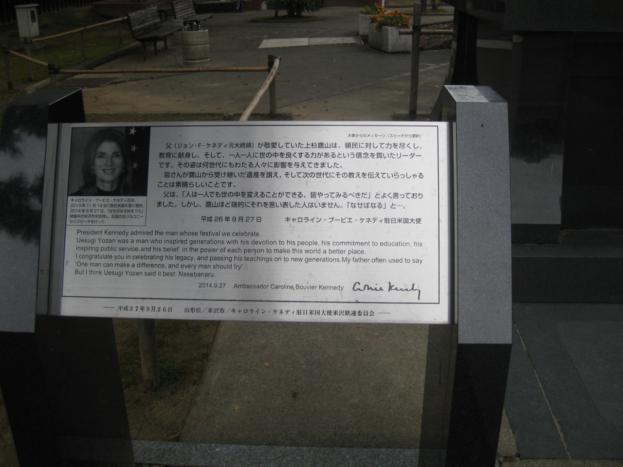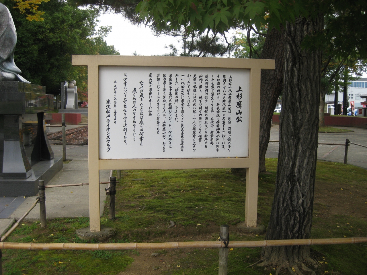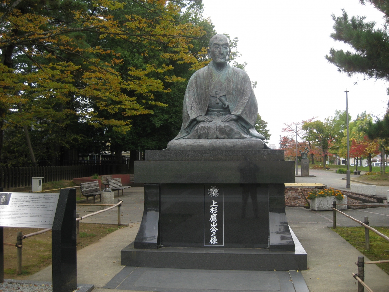 米沢城址に隣接する松岬神社前のある米沢藩九代藩主上杉鷹山(治憲)公の坐像。領地返上寸前の米沢藩再生の偉業を成し遂げ江戸時代屈指の名君としてあまりにも有名。日向国高鍋藩第六代藩主秋月種美の次男でうまれ十歳で米沢藩主重定の養子となり、苦しみ続けた藩財政を節約だけでなく養蚕、蝋、菊等の産業振興もはかり健全化を成し遂げました。”なせば成るなさぬは・・・”の言葉でも有名です。私利私欲でなく公利第一を掲げて行動する姿は現在に一番必要なことだと坐像を見て痛感します。