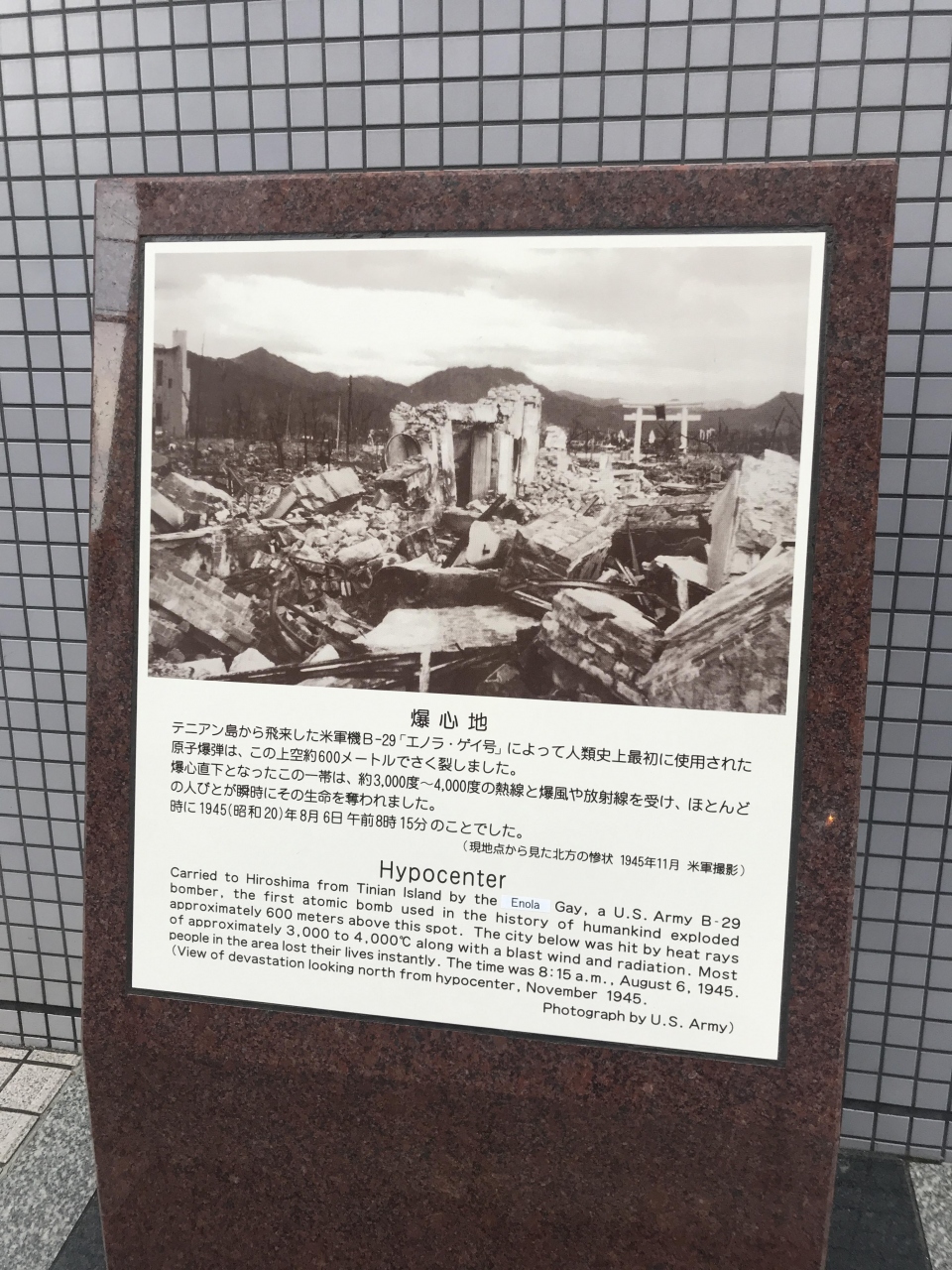 爆心地のところはなんと病院になってました。人を傷つけるものが落ちた場所が、今は病院になってるなんて、なんかすごいなと思いました。爆心地となった空は、高い建物もないので普通に見上げられてて、ここで・・・と思うととても胸が痛いです。