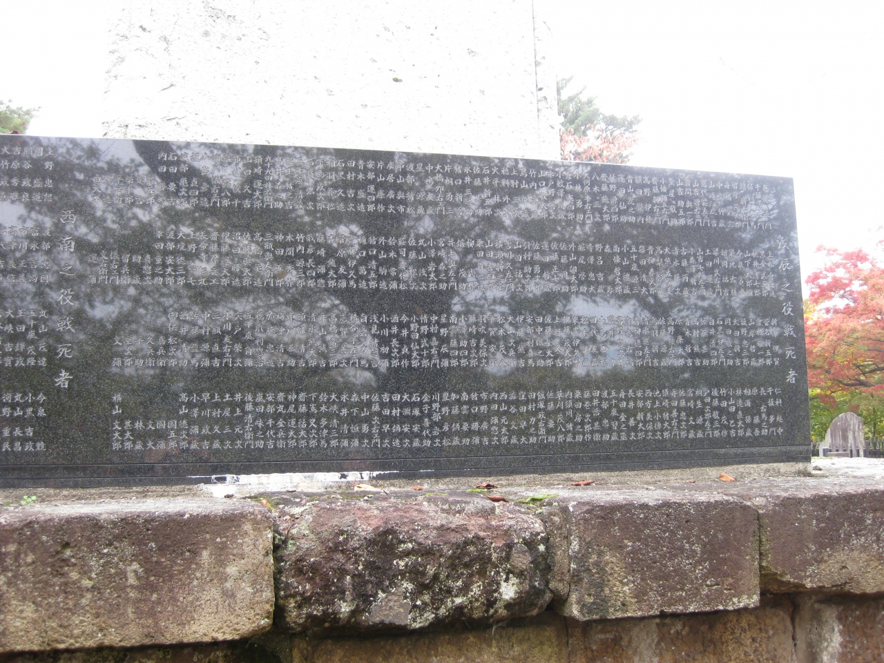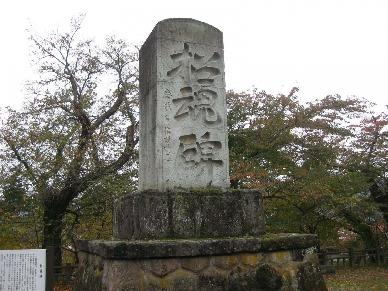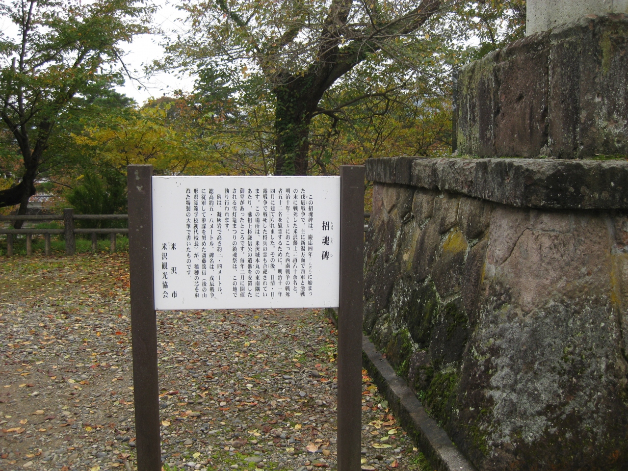 米沢城址の本丸跡謙信公祠堂跡の横に堂々と建つ大きな石碑。明治11年に戊辰戦争、西南の役(明治11年)で戦死した米沢の郷士を慰霊するために建てられました。高さ340cm、一辺143cmのほぼ四角柱の形で台座を合わせると約5.8mの大変大きな石碑です。上杉の仲間を思う気持ちが強く感じられます。