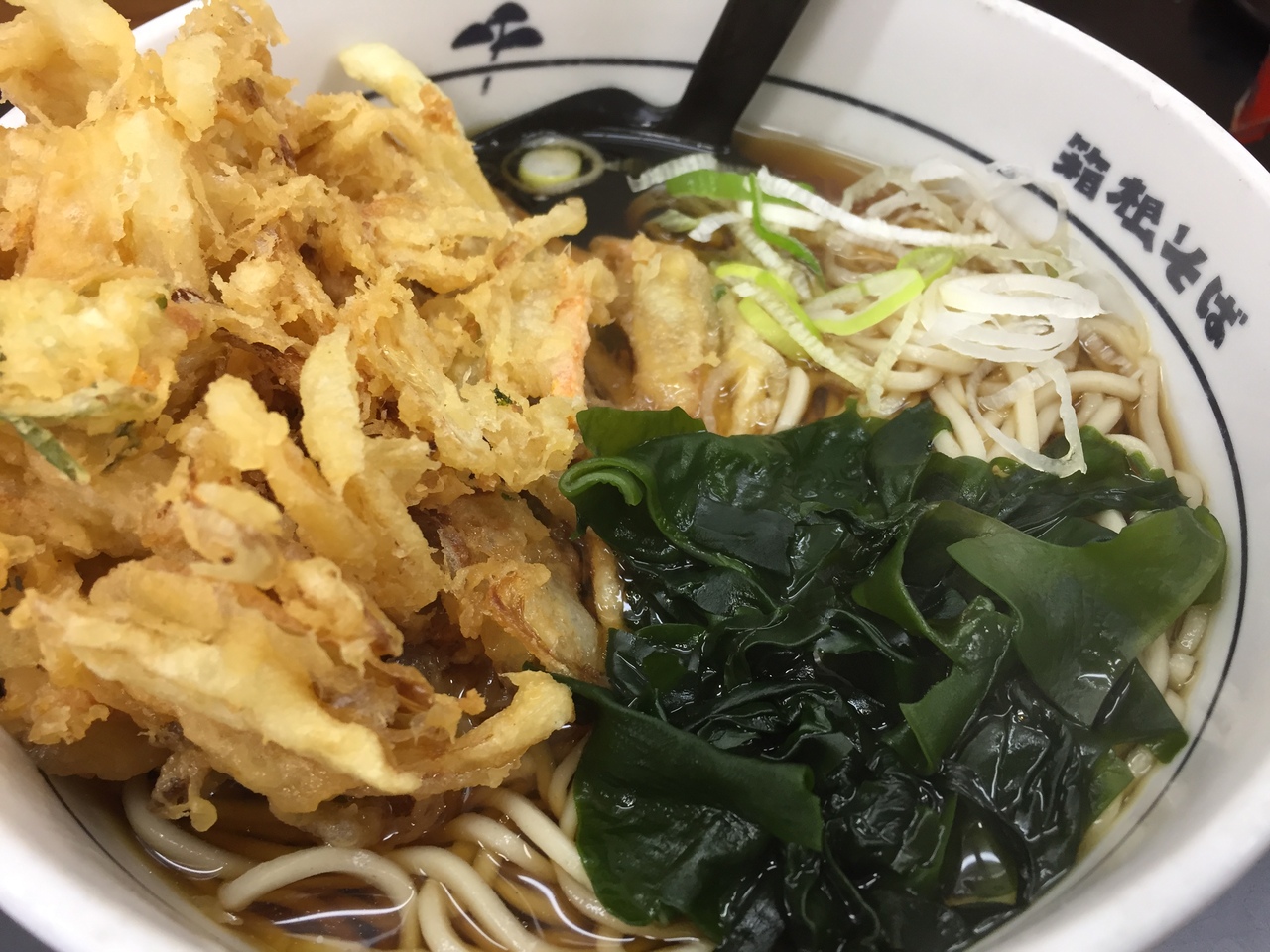 お買い物に疲れて少し小腹が空いたので箱根そばに。はじめに食券を買い、おじさんに渡して遊びを待ちます。かき揚げが大きくてかなりボリューミーです。おねぎとワカメが入って少しだけヘルシーです。店内は狭く簡易な椅子があります。