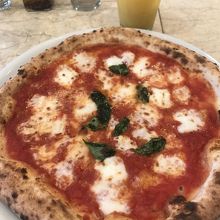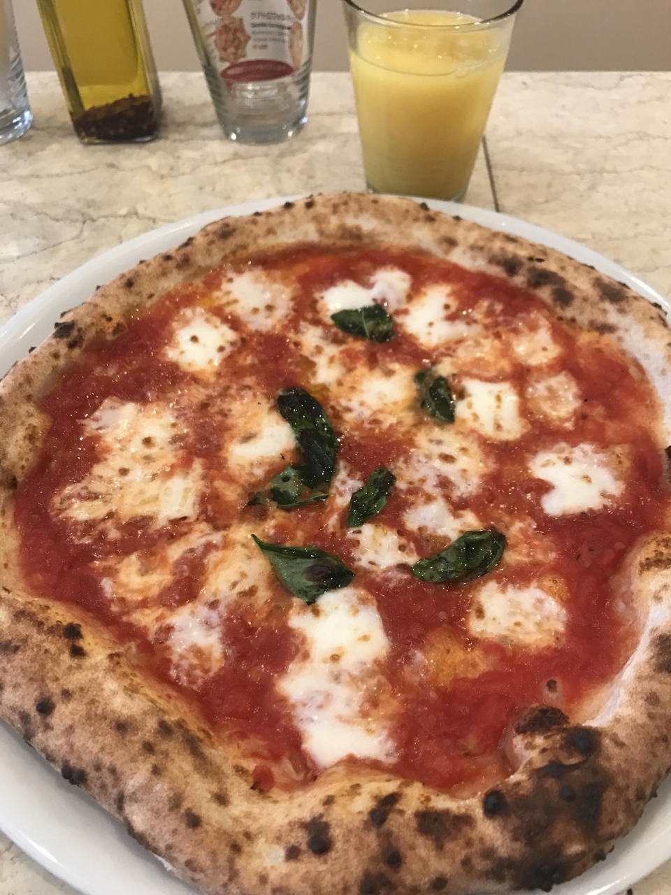 大阪らしい食べ物ではないのですが、ナポリピッツァに惹かれて寄ってみました。カウンターのみのお店で、入り口で食券を買って空いてる席に座ります。オレンジジュースが100円なのがびっくりで思わず注文してしまいました。マルゲリータを注文。生地が薄めで、耳は厚いです。カット面からオイルが滲み出ないためとカットはされておらず、自分でナイフとフォークで切って食べます。イタリアみたいです。このお店では三角にカットして手で食べるか、細かいカットしてフォークで食べる方法が紙に紹介されていましたが、ソースがかかった生地と耳を一緒に食べた方が美味しかったので、折りたたんでたべました。冷めてくるとカットするのも大変です。日本で食べるピザがもっと安くなると嬉しいです。