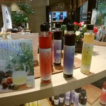 素材にこだわった出汁や酢(飲用)が、キレイに陳列されています。その数は相当なもの。