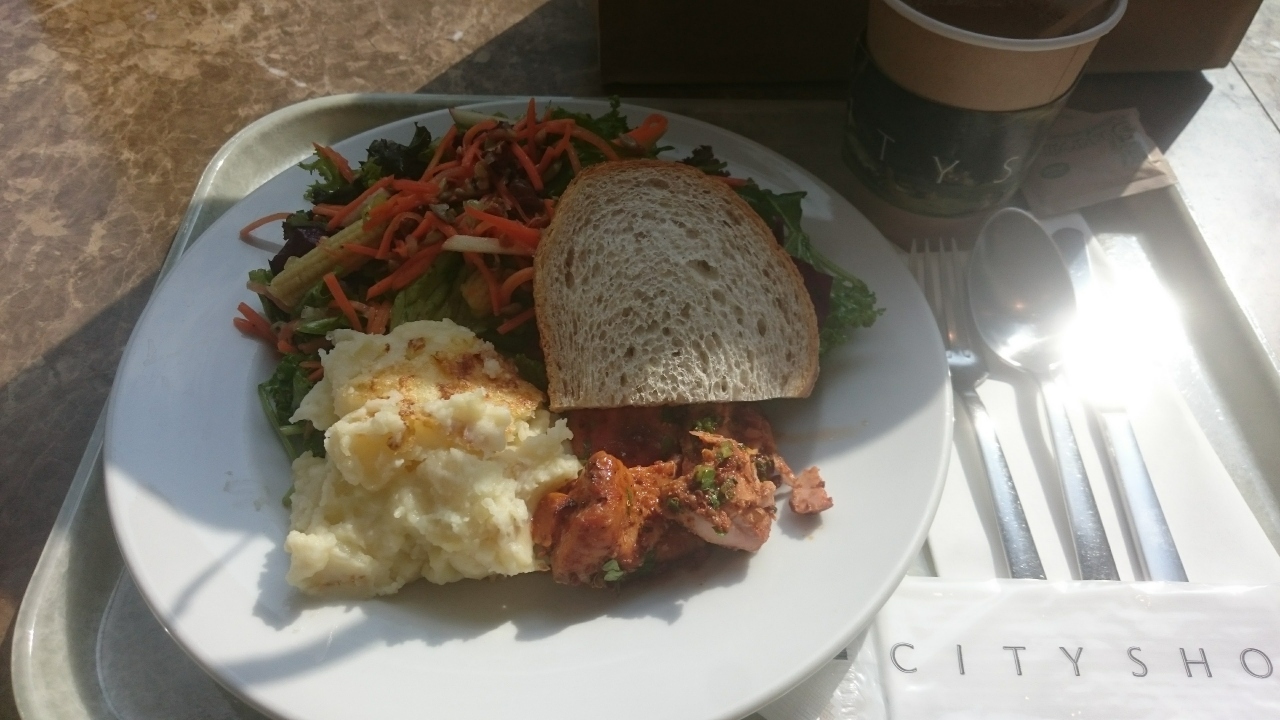 サラダにトッピングが2種類とドレッシングが選べます。薄いパンもついてきます。かなりボリュームあります。デリはグラタンやタンドリーチキンがオススメです。
