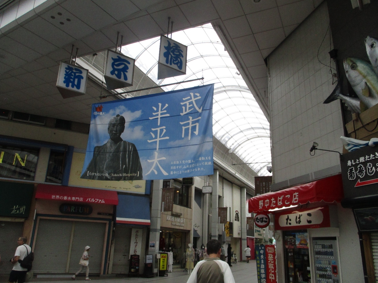 高知城、ひろめ市場などを巡った後に帯屋町一丁目商店街などのアーケードを通ってはりまや橋観光バスターミナルへ向かいました。
