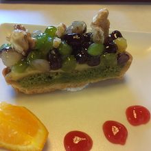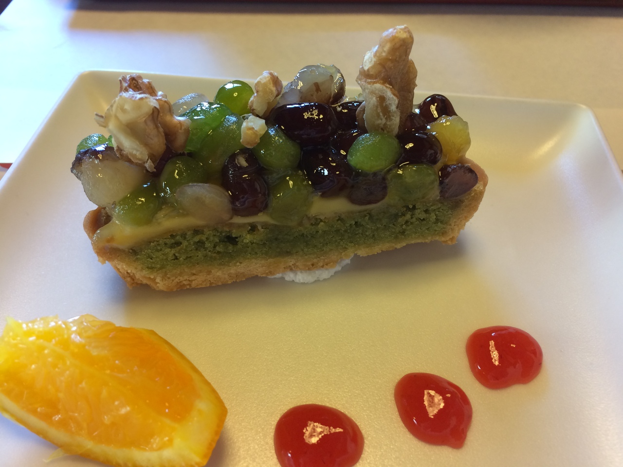 中田屋さん2階のカフェで休憩しました。1階にケーキのショーケースがあり美味しそうな甘納豆のお菓子がならんでました。どれも美味しそうで迷いました。