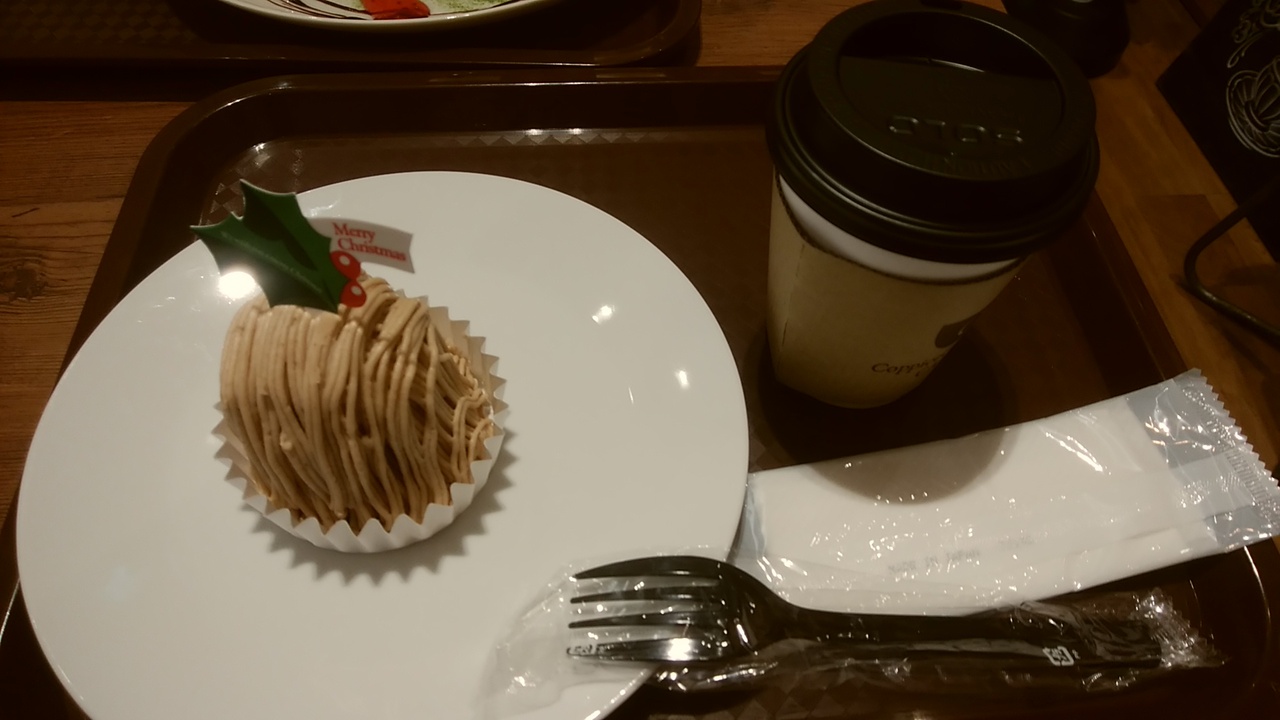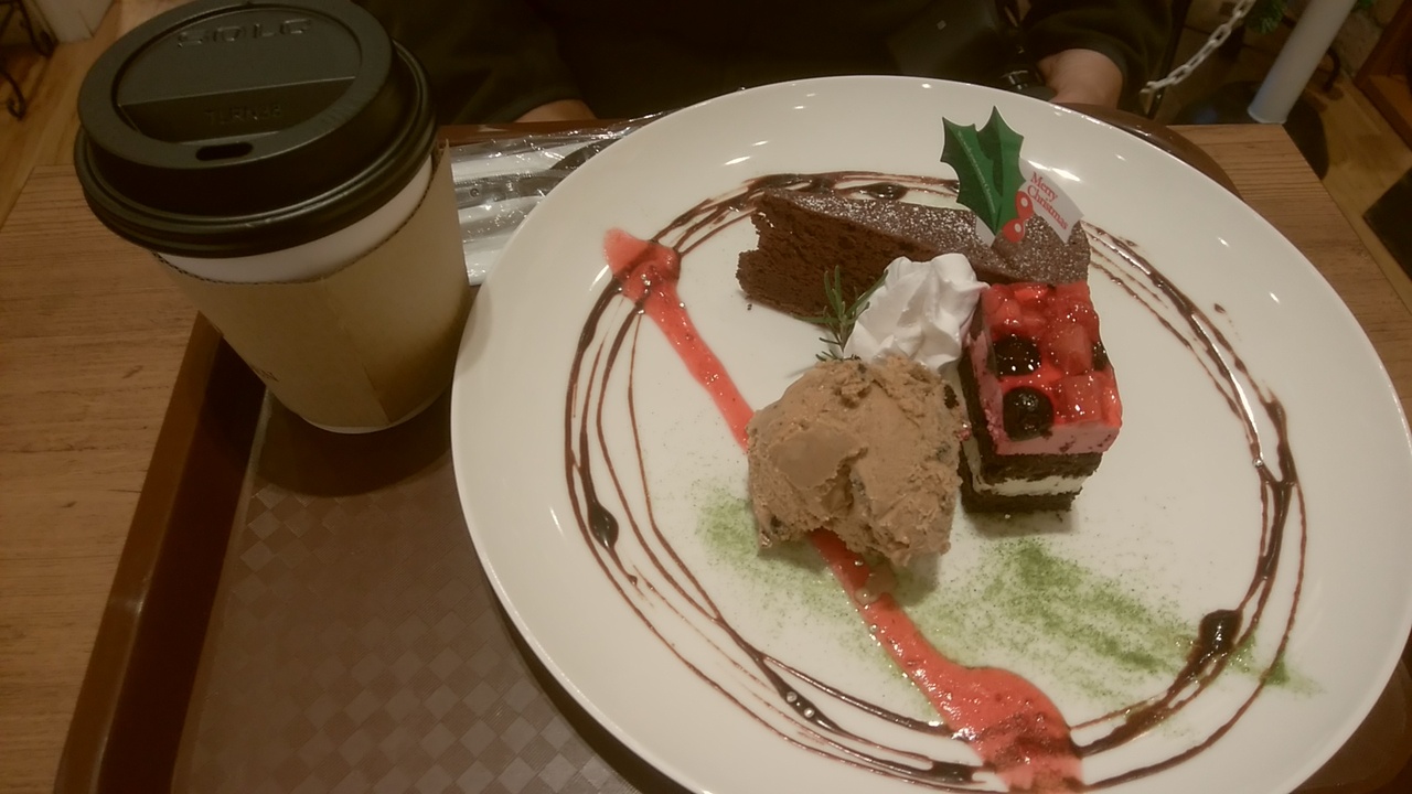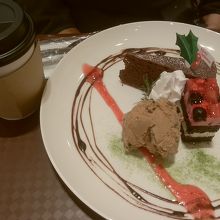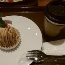 甘党の私たちは美しいバラを観賞後、カフェラテとスイーツをいただきました。栗好きの私はモンブラン。夫はスペシャルプレート。