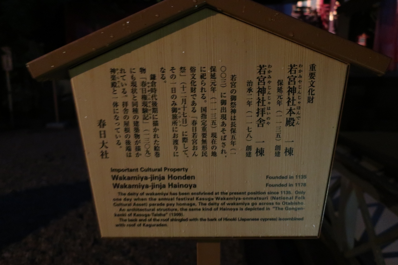 春日大社の摂社・末社である若宮15社の第1番納札社が若宮神社です。春日大社の本殿から南側に向かった場所に鎮座されています。森に囲まれたこじんまりとした神社で春日大社の本殿と同じ春日造りになっていますが、大社では間近で見られませんが、こちらでは間近で見られます。