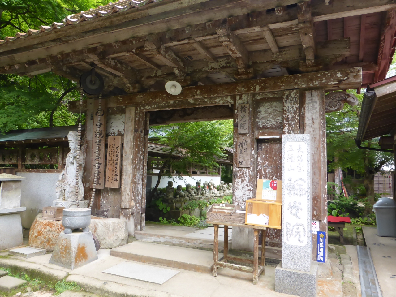 三佛寺に向かう階段の途中にある宿坊です。お昼に精進料理も頂けるようですが、今回は見学のみ。山門の傷みがひどくちょっと不安になりますが、中は普通です。右側に並んだお地蔵様が様々な表情、形ををしており楽しめます。山門には「百八煩悩転生大念珠」があり、念じながら念珠の下に引くと厄除け開運になるそうです。