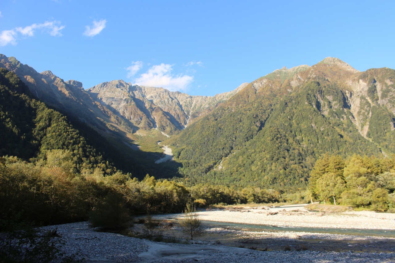 上高地に来るとほぼどこでも見ることできますが、山々との景色が美しい展望の開けた場所も、数か所あります。河童橋の上はもちろん、橋を渡ってしばらく歩いた場所、右側のキャンプ場の先などがよく見えます。ここは人気の観光地なので人が多いのが難点ですが、仕方ないですね。
