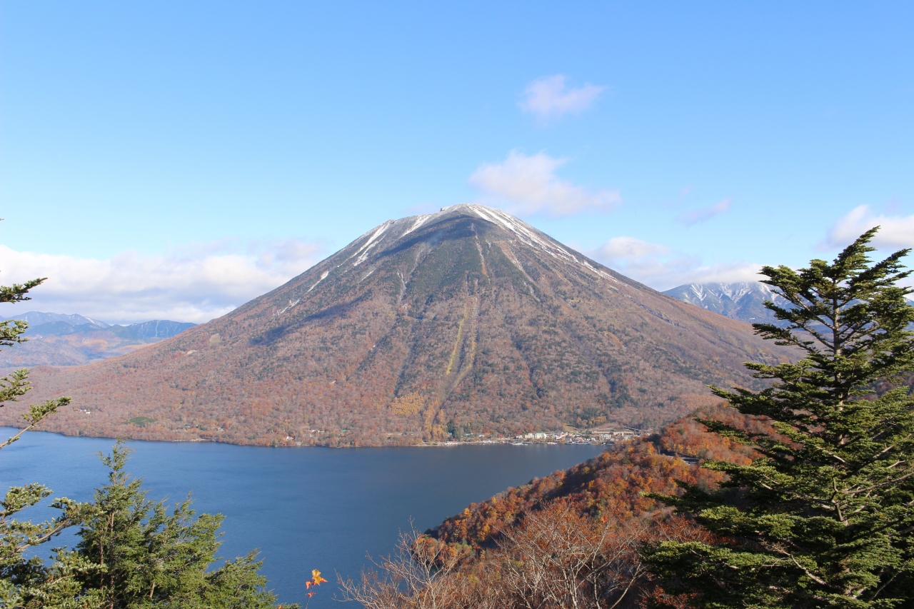 中禅寺湖畔にどんと構える男体山。気軽に登れそうな感じもしますが、かなりの体力を必要とするとのことです。中禅寺湖と合わせて見える展望台もあり、なかなかよい眺めです。紅葉の終盤の時期だったので、男体山はすでに冬枯れの山となっていました。