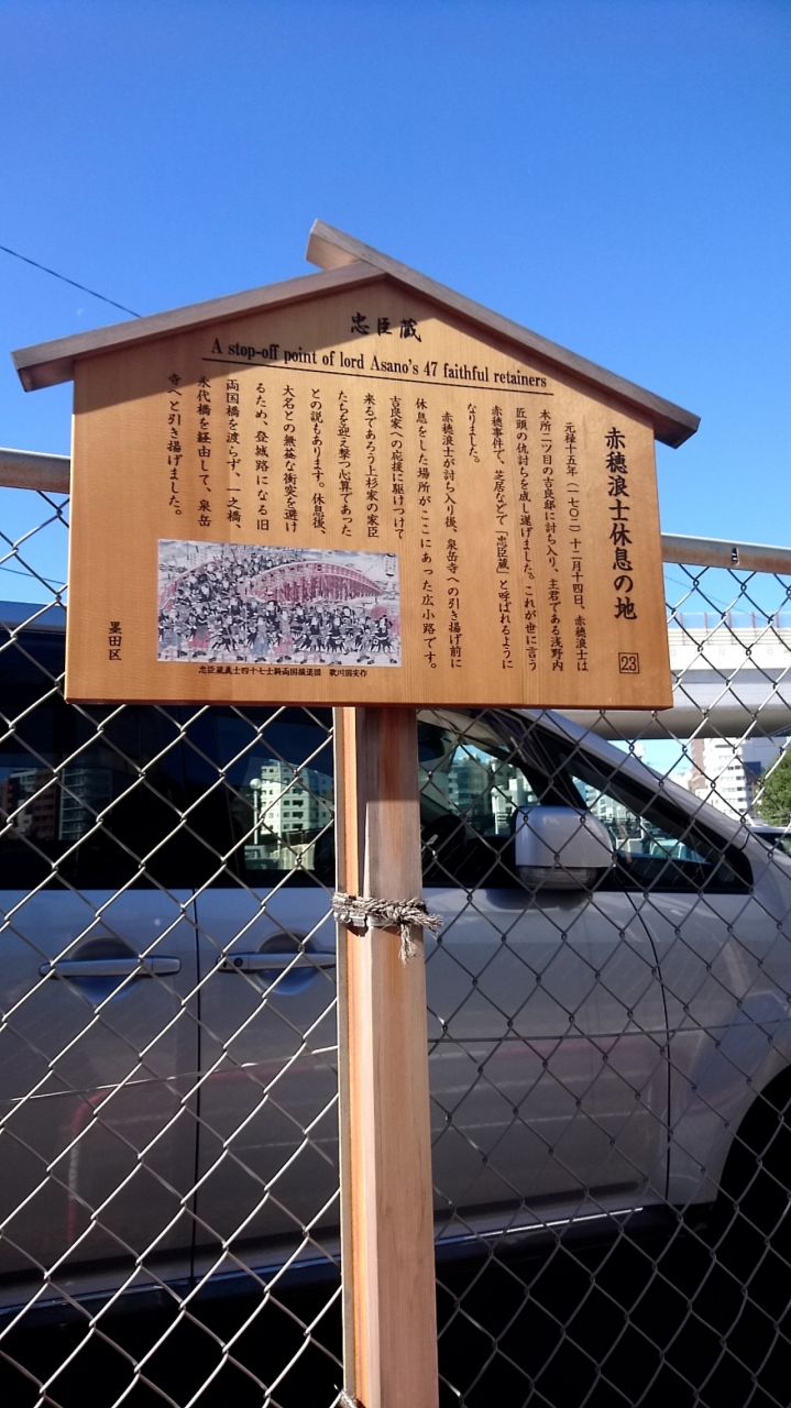 JR両国駅から徒歩数分の駐車場のフェンスに、3枚の説明板が設置されており、そのうちの一つが赤穂浪士休息の地の説明でした。吉良邸討ち入り後に、泉岳寺に引き上げる前に、説明板前の広小路で休憩したらしいです。泉岳寺までのルートには、あちこちに赤穂浪士の足跡が残されており、忠臣蔵ファンにはたまりません。