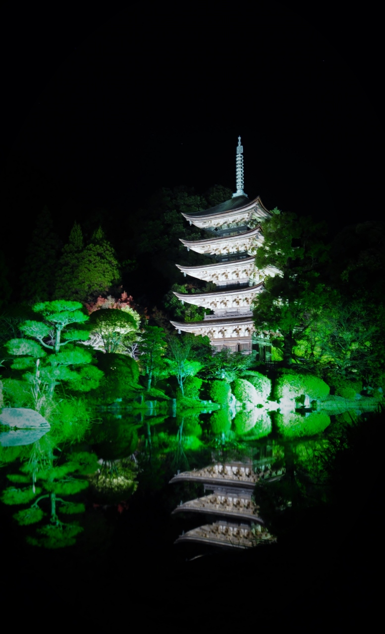 知人からぜひ紅葉の季節に見に行くとよいと強く勧められ、紅葉の中で美しい五重塔が見たくて勤労感謝の日にやってきました。到着したのは午後6時過ぎで辺りは真っ暗。でもライトアップされた五重塔を見に来る人たちが他にもいて、その人たちに付いていくと、奥の駐車場から階段を上がって直接五重塔の横に出ました。五重塔は二方向からライトが当てられていますが、それほど明るくなく、幽玄とした雰囲気です。しかし、周囲の木々は明るくなく、五重塔しか見えないので、きれいという感じではありません。防府のホテルで一泊して翌朝再訪しました。手前の駐車場に車を置いてトイレ近くの入り口から入った方が、池の向こうに五重塔が見えて綺麗です。やはりライトアップの夜よりは明るい方が美しく見ることができます。池の水面に反射する姿も綺麗です。さすが国宝だけあって、落ち着きのあるよい姿をしています。無料駐車場は広く、拝観料も無料なのでとてもうれしいですね。