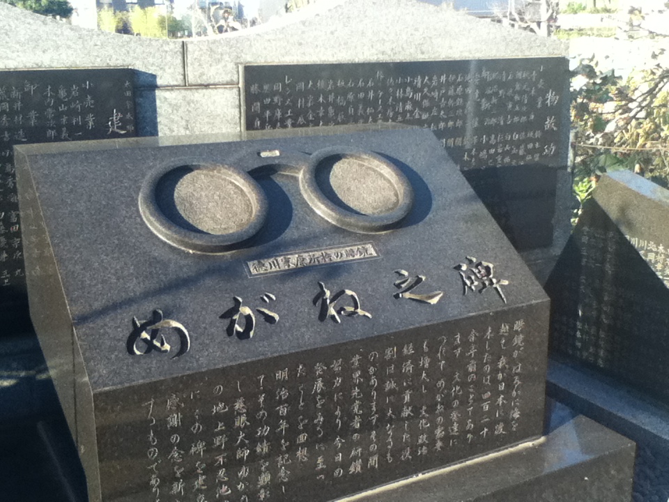 不忍池の弁天島には多くの石碑があり、その一つがこちらのめがねの碑である。お勧めの点は、石碑は徳川家康の愛用した眼鏡がかたどら綺麗であること、東京の眼鏡業界の組合が業界発展に寄与した先覚者への感謝を表すために昭和43年に建立したこと、徳川家康や当時の人々がメガネをつけた様子を楽しく想像できること、周辺の石碑と併せて見るのもいいかもしれないこと、駅から徒歩で行けることである。