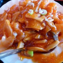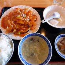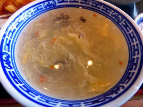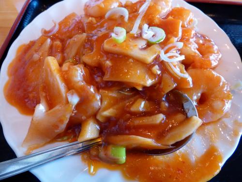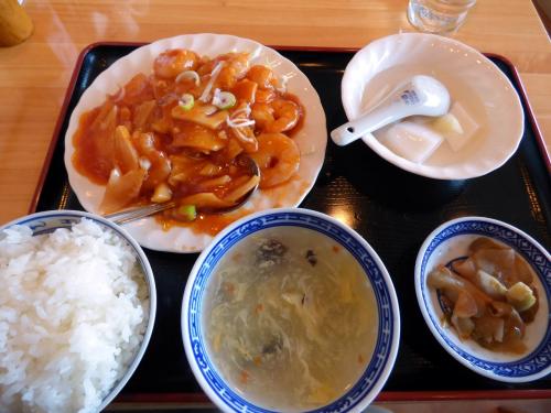 この日食べた海老のチリソース定食は海老の数は少ないものの美味しく、スープにザーサイ、お替り自由なご飯にデザートの杏仁豆腐もついて¥1,080-とコスパはいいです。