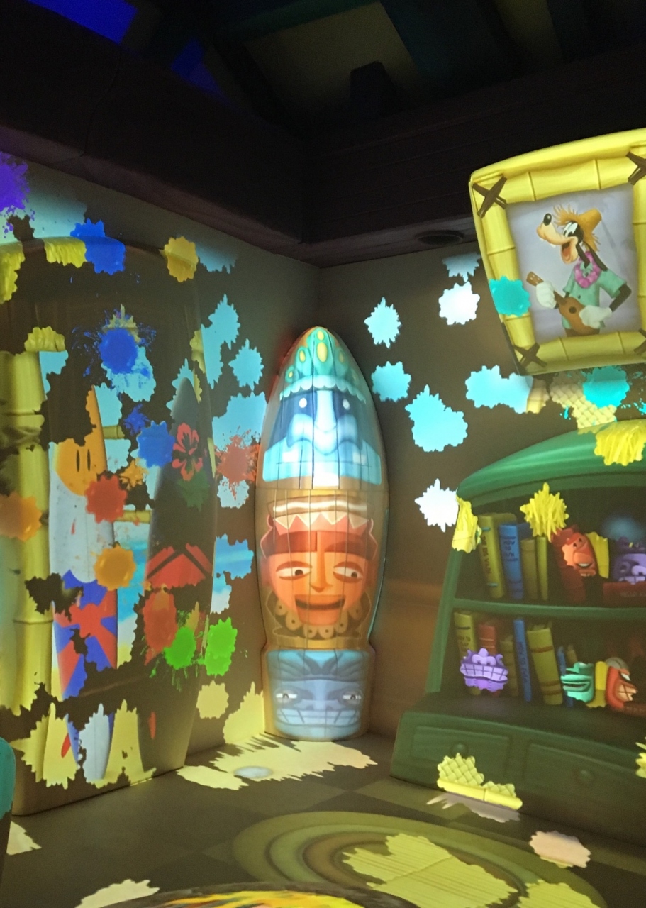 グーフィーのペイント&プレイハウスはトゥーンタウンの中にあります。見て楽しむだけではなく、遊べるお家です。スクリーンに絵の具を飛ばして色を塗っていく遊びで、内容は子ども向けでした。4歳の娘は自分が飛ばした絵の具を見て嬉しそうでした。