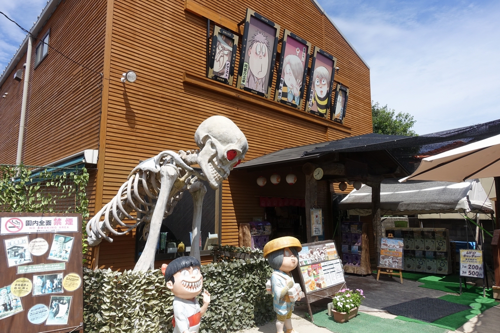 園内には妖怪のキャラクターがあちこちにあるので写真スポットになってます。特に入口の主要な妖怪が勢揃いしている看板の所と、奥の巨大なガイコツがいる所がおすすめです。子どもが一緒なら鬼太郎の家やすべり台みたいになってる一反木綿もいいんじゃないでしょうか。入るだけなら無料なので気軽に行ってみるといいですよ。
