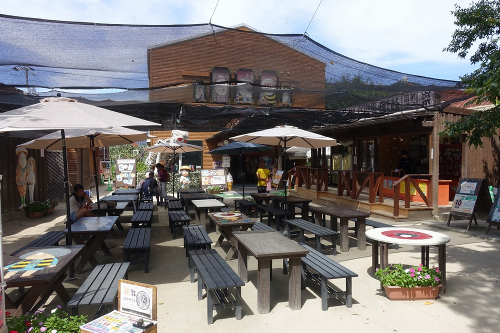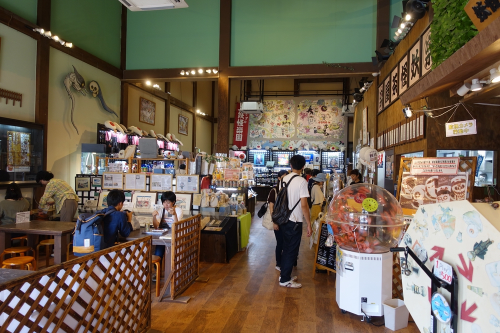 小さな妖怪テーマパーク的なつくりになっていて、射的やスマートボールなどができる妖怪縁日小屋、軽食がとれる妖怪茶屋もあるしお土産も売っているので、大人から子供まで楽しめると思います。水木しげる記念館の裏にあるため、記念館の中庭に出た時にこの射的の歓声が聞こえてきました。