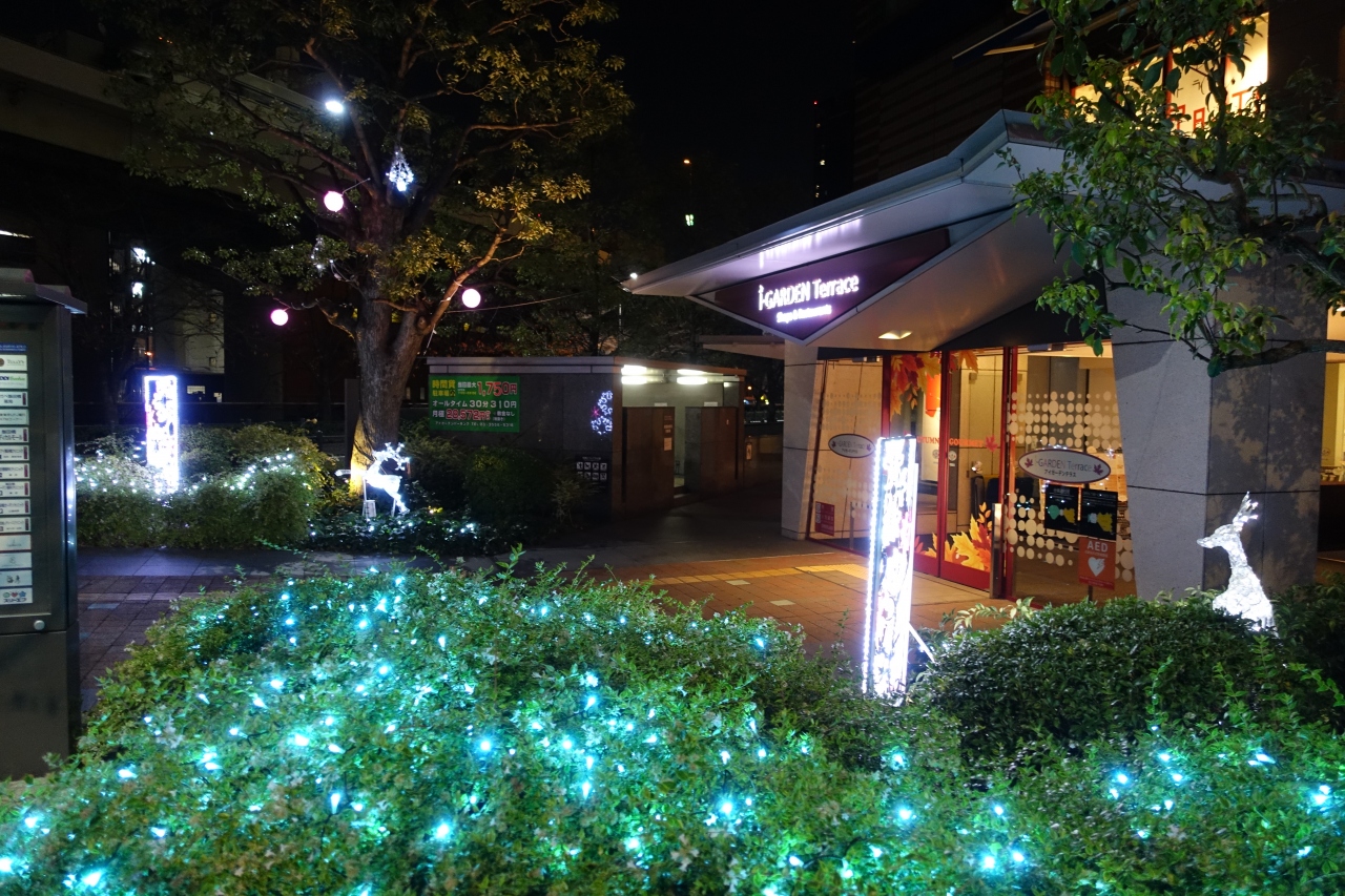 夕食後に東京大神宮にお参りし、その後、宿泊ホテルまで戻る途中に、「飯田橋アイガーデンテラス」に立ち寄りました。年末が近いという事で、イルミネーションが美しく、周囲にはさほど灯りがない事から、暗がりの中に浮かび上がる様でした。