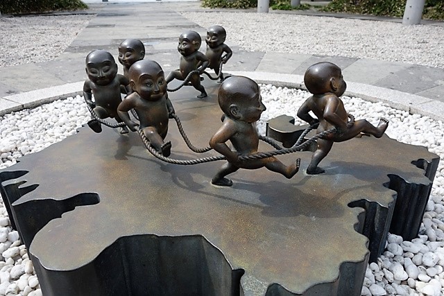 おもしろオブジェは、九州の形をした土台に「縁結び七福童子」という子供が、電車ごっこしているオブジェです。せんとくんと同じ人がデザインされたそうで、頭を撫でると願いが叶うんだとか。