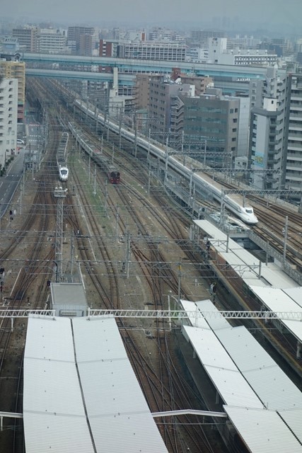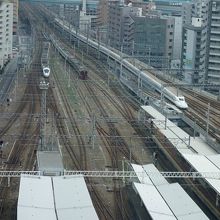 少しわかりにくいですが、奥まった所に、JR博多駅のホームが真上から見られる場所があり、ホームに出入りする列車がたくさん見られます。鉄道写真を撮られている方もいました。