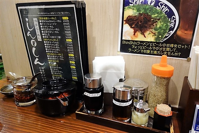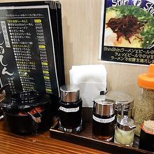 テーブルには餃子のタレ、らーめんのタレ、ニンニク、紅ショウガ、ラー油、すりごま等あって、自分でカスタマイズすることもできました。
