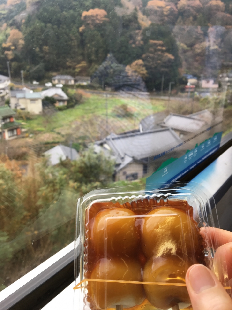 開国だんごを帰りの伊豆急でおやつにしました。小豆餡をみたらし団子でくるんだものです。