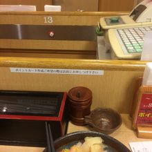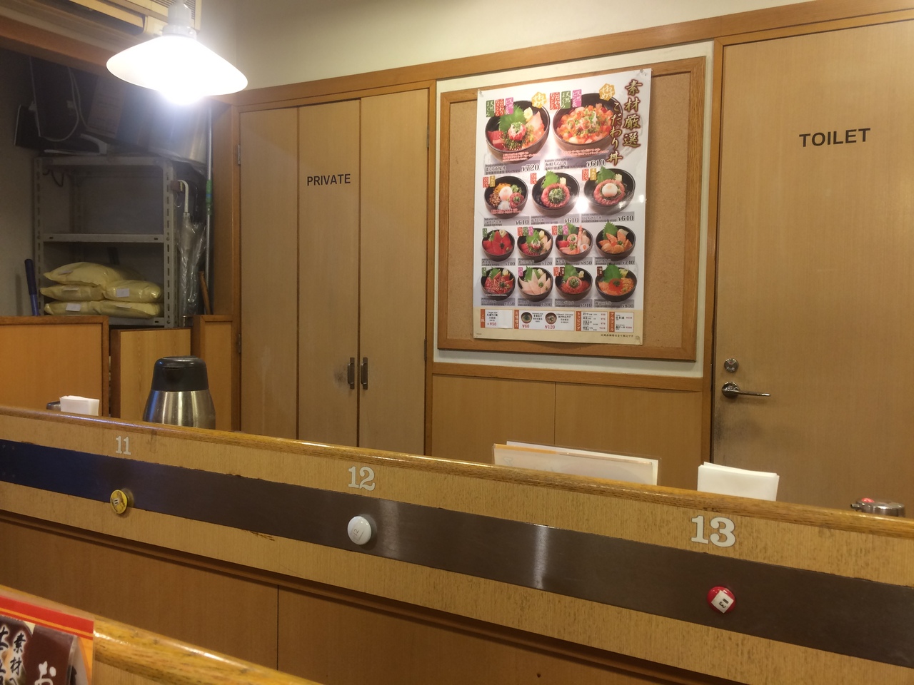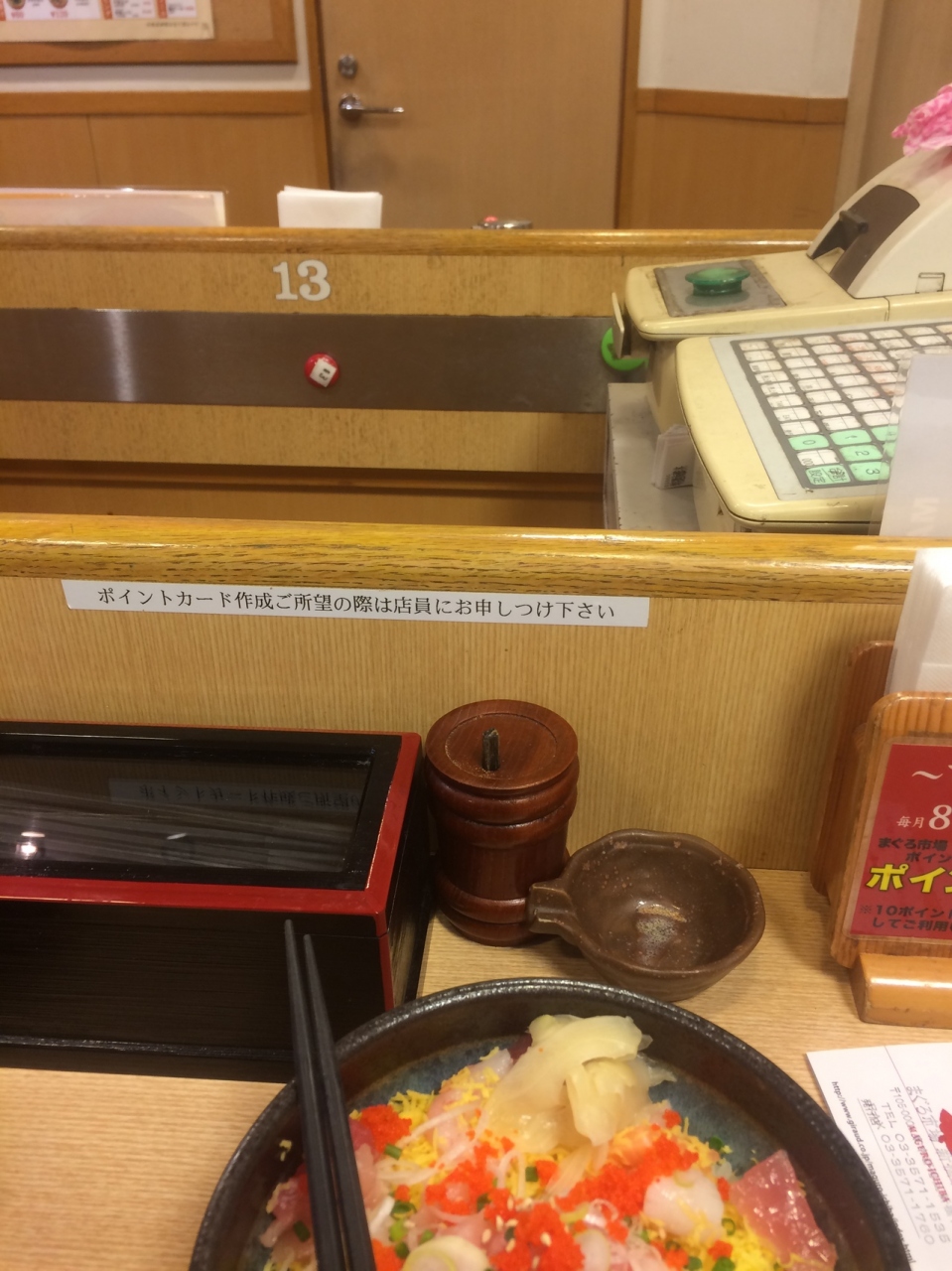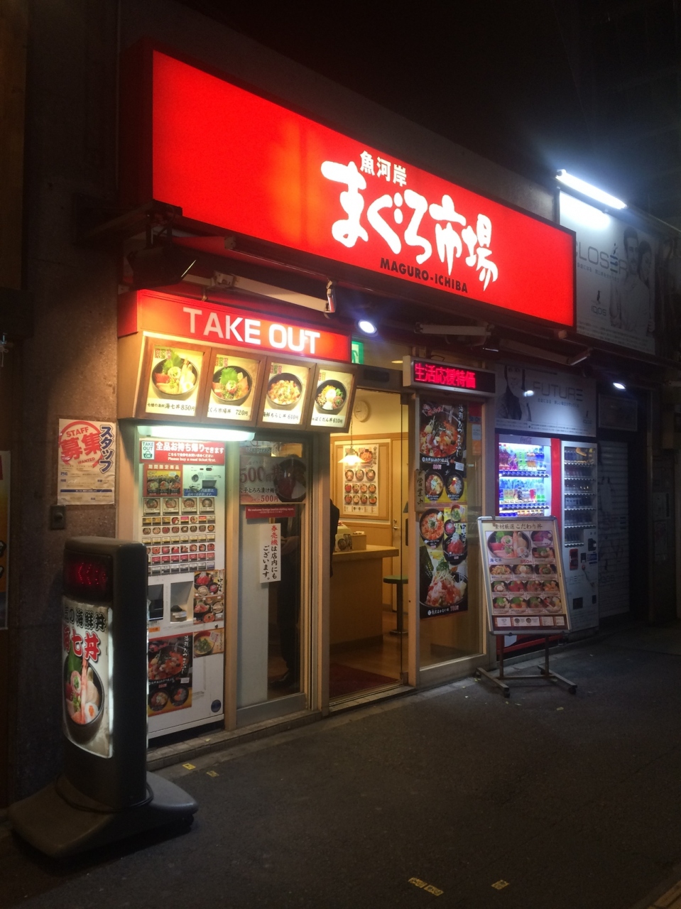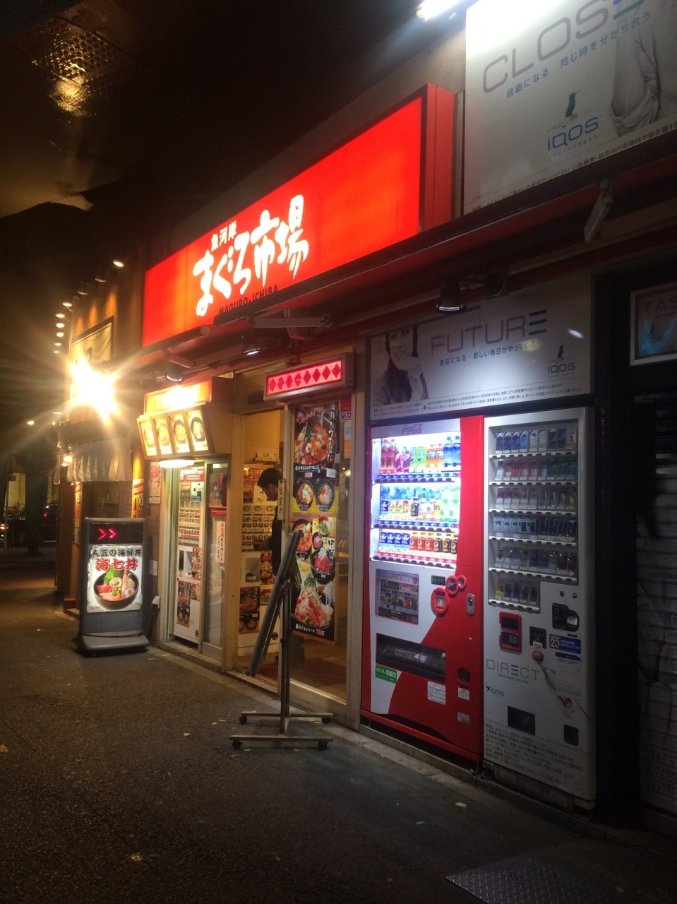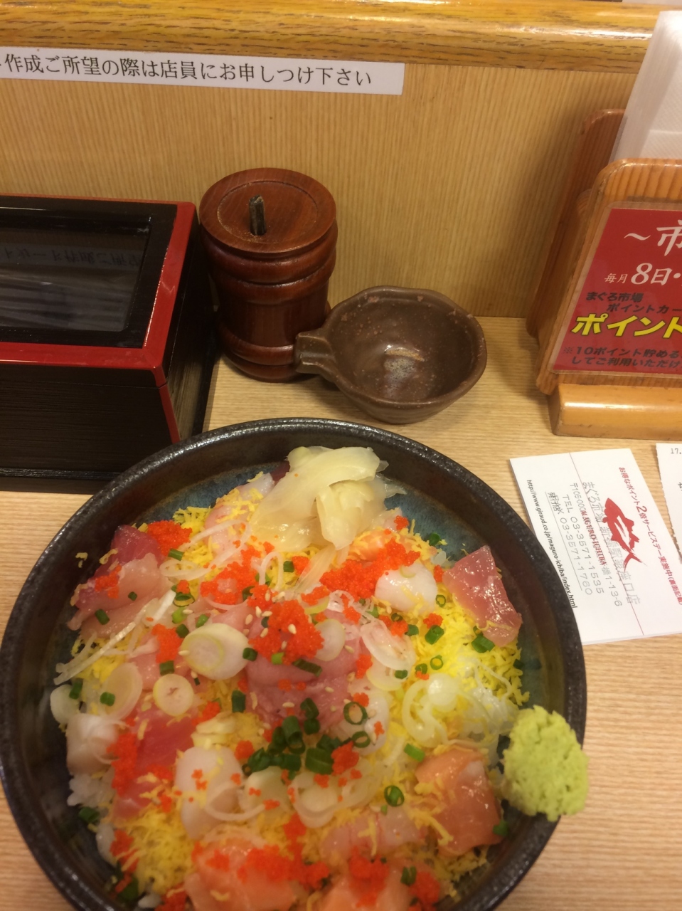 店外と店内に自動食券機があり、店内はカウンター席のみの狭い店でした。海鮮ちらし丼を食べました。食券渡してから3分もしないうちに出てきました。細かく切ったまぐろが程よくのっかっていてネギ、えびもありました。甘い醤油をかけて食べました。夜遅い時間に行きましたがご飯にはのった刺身がある新鮮でした。