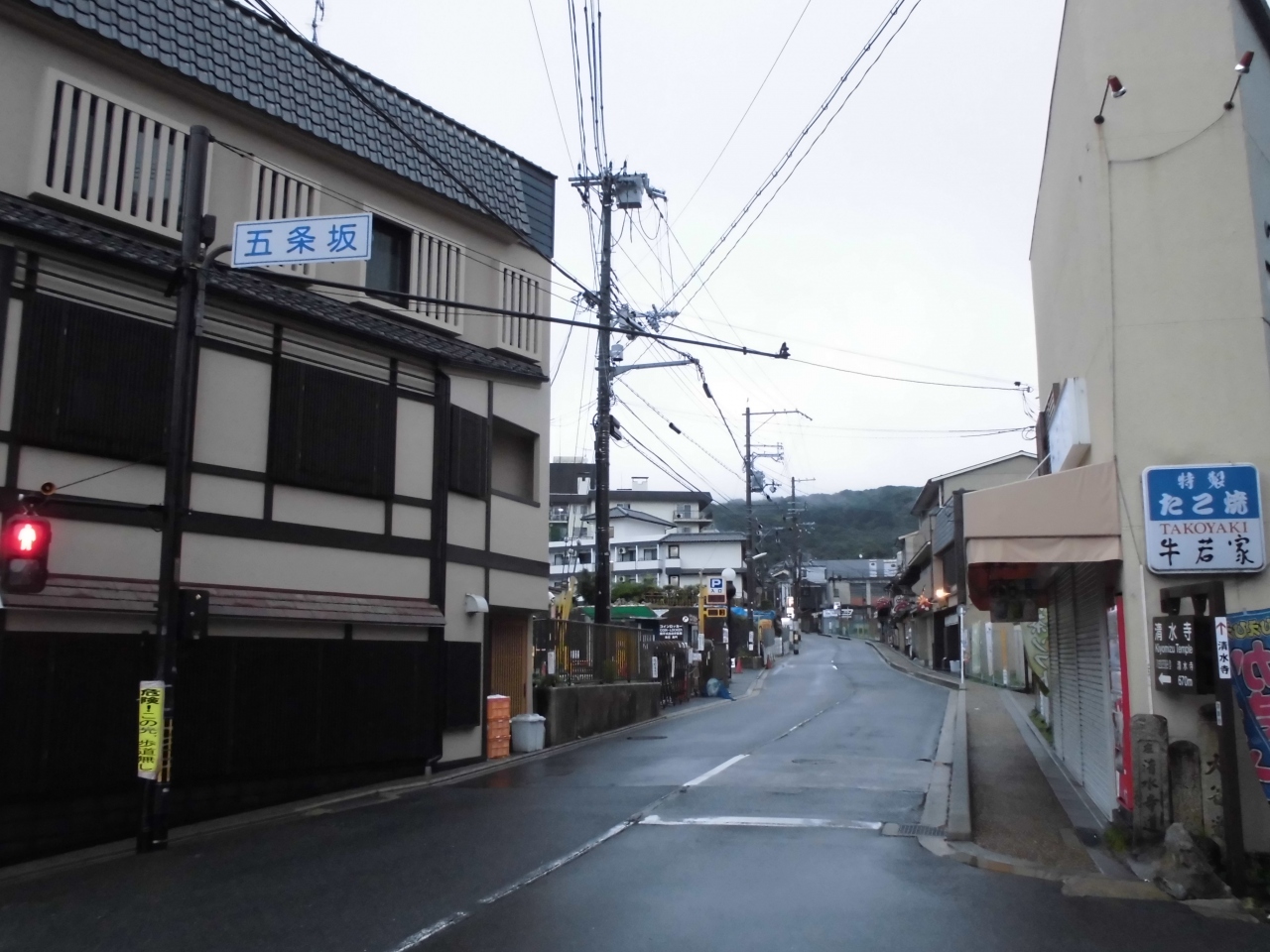 京都駅からバスに乗って清水寺に行くとき、バス停を降りてすぐの交差点から出ている坂です。交差点に五条坂の看板がありますからすぐわかります。