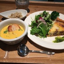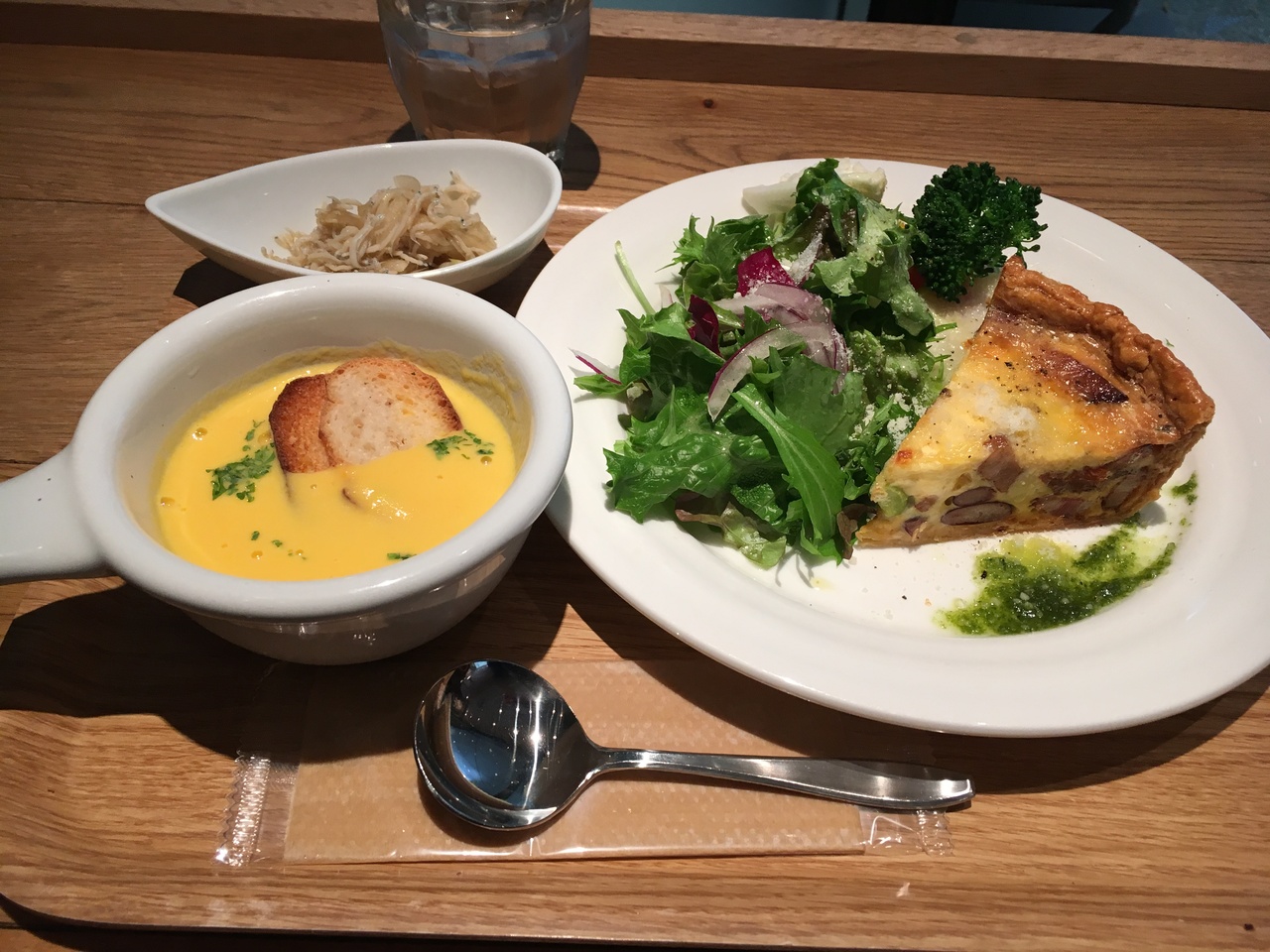 ランチに行きました。メニューは自家製ローストビーフどんぶり、キハダマグロとアボガドのどんぶり、キッシュとサラダとスープのランチそれぞれ1080円、シェフのおすすめランチ1188円です。自家製キッシュ頂きました。イベリコベーコンとモッツァレラチーズが入っていてスープはニンジンのポタージュで美味しかったです。
