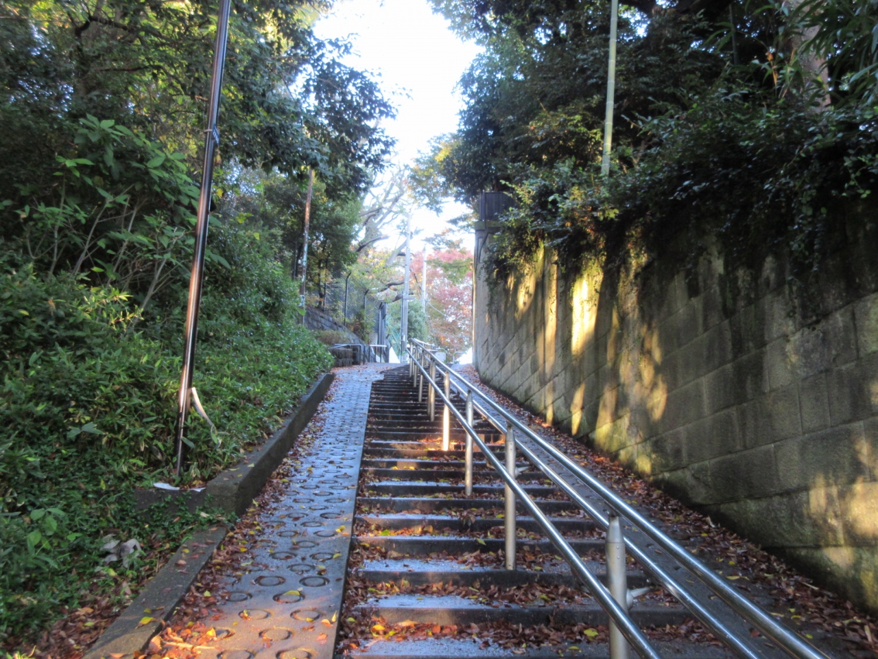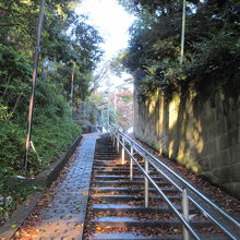 「胸突坂」といわれ、胸が突くほどの坂だろうと説明板を読む前から名前の意味が想像できました。事実想像通りで、坂下から見上げると上ることに抵抗を感じるくらいの坂でした。でも階段になっており手摺もあったので思うほどつらい坂ではありませんでした。