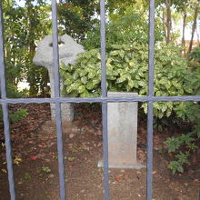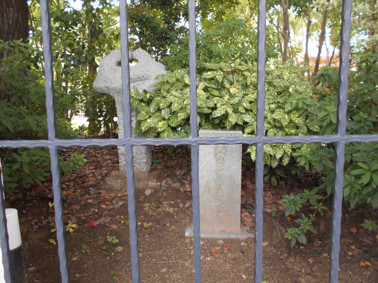 リーガロイヤルホテルの入り口前の道ぞいにあります。ホテルまでは行かず、玉江橋寄りです。なぜか柵があり、その中に鍵のような形の碑がありました。