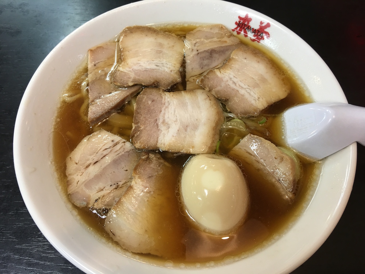やってきたラーメン、薄く柔らかいチャーシューがたくさん、そして半熟の味玉も入っています。醤油風味のあっさりスープと縮れた中太麺は典型的な喜多方ラーメンのもの。喜多方ラーメンとしては並の味ですが、普通に満足できました。